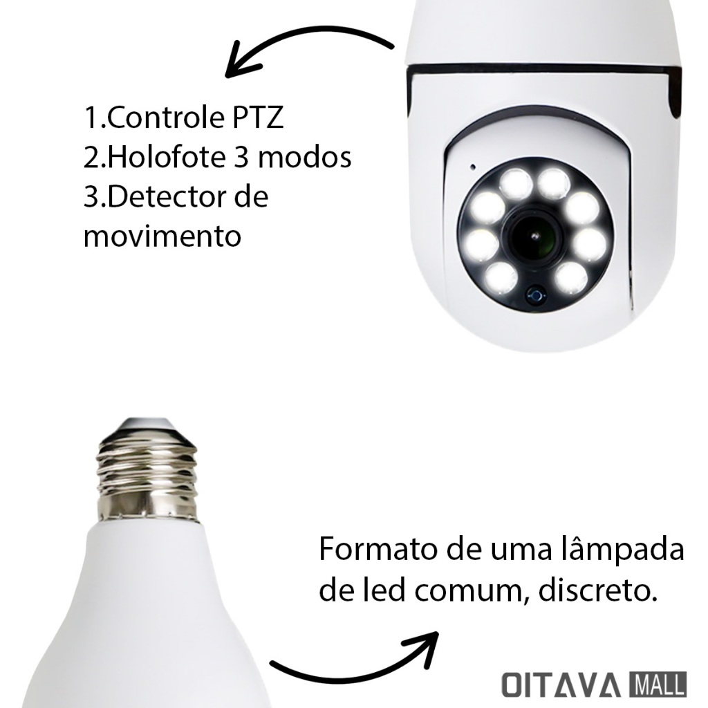 Câmera IP Lâmpada Espiã Wi-Fi 360° Full HD com Auto Tracking e Áudio Bidirecional Transforme a segurança da sua casa ou empresa com a Câmera Lâmpada IP Wi-Fi 360°, uma solução inteligente, discreta e de alta tecnologia que une design moderno de lâmpada LED com recursos de vigilância profissional. Com instalação simples no bocal comum (E27) e conexão Wi-Fi 2.4GHz, ela oferece monitoramento remoto, visão panorâmica completa e comunicação em tempo real diretamente pelo seu celular. A câmera garante imagens em Full HD 1080p, visão noturna colorida, detecção de movimento automática e função Auto Tracking, que acompanha qualquer movimento na área monitorada. Ideal para uso residencial e comercial, é perfeita para monitorar crianças, idosos, animais, escritórios, garagens e lojas. Principais Benefícios: 💡 Instalação simples: basta rosquear no bocal de lâmpada comum (E27). 📱 Controle total via celular: visualize, grave, gire e acenda a luz remotamente. 🎥 Resolução Full HD 1080p: imagens nítidas, coloridas e de alta definição. 🔭 Visão panorâmica 360° PTZ: rotação de 355° horizontal e 100° vertical. 🌙 Visão noturna colorida com LEDs brancos: imagem clara mesmo no escuro. 🧠 Detecção de movimento + Auto Tracking: acompanha automaticamente o movimento. 🔊 Áudio bidirecional: escute e fale em tempo real pelo aplicativo. ☁️ Armazenamento seguro: suporta cartão microSD até 128 GB (Classe 10) e gravação em nuvem. 🔌 Plug and Play: sem fios, sem complicações — conecte e use. ⚙️ Compatibilidade universal: funciona em Wi-Fi 2.4 GHz (não compatível com 5 GHz). Especificações Técnicas: - Tipo: Câmera IP Lâmpada Espiã 360° - Resolução: Full HD 1080p / 2 MP - Lente: 3.6 mm - Rotação: 355° horizontal / 100° vertical - Conectividade: Wi-Fi 2.4 GHz (não suporta 5 GHz) - Visão Noturna: LEDs infravermelhos + LEDs brancos (ativação automática/manual) - Armazenamento: Cartão microSD até 128 GB Classe 10 - Compressão de vídeo: Smart H.264 - Áudio: Bidirecional (microfone e alto-falante integrados) - Proteção: IP44 (resistente a poeira e respingo de água) - Zoom digital: 4× via aplicativo - Potência: 3 W - Instalação: Soquete E27 + suporte de fixação - Aplicativo: Yoosee (Android / iOS) - Recursos extras: ONVIF / Auto Tracking / Detecção de movimento / Controle de luz remoto Conteúdo da Embalagem: - 1 × Câmera Lâmpada IP 360° Full HD - 1 × Suporte para fixação E27 - 1 × Kit de parafusos - 1 × Manual de instruções Aplicações Ideais: - Casas • Lojas • Escritórios • Garagens • Salas • Quartos • Ambientes comerciais