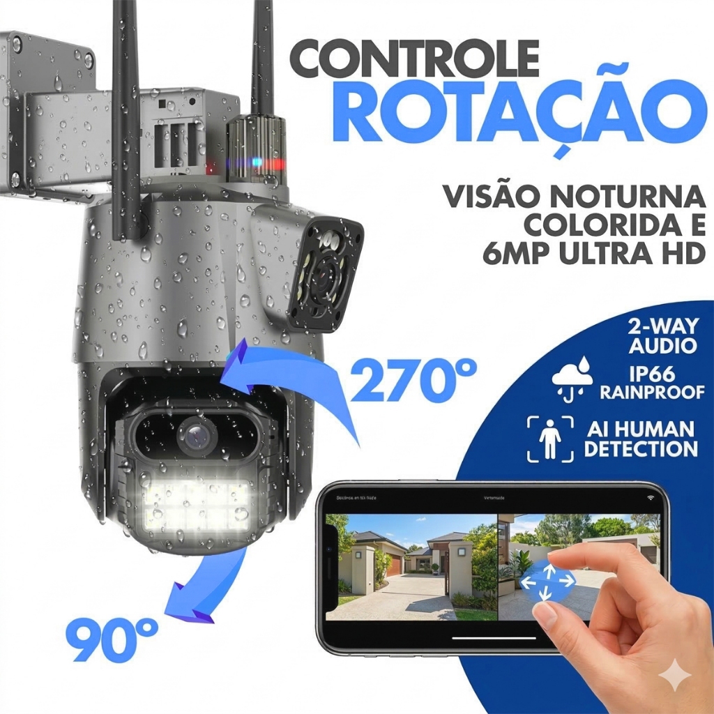 Câmera Segurança Externa Resolução 6MP Dupla Lente Wifi - Visão Noturna Colorida e Rotação 360º