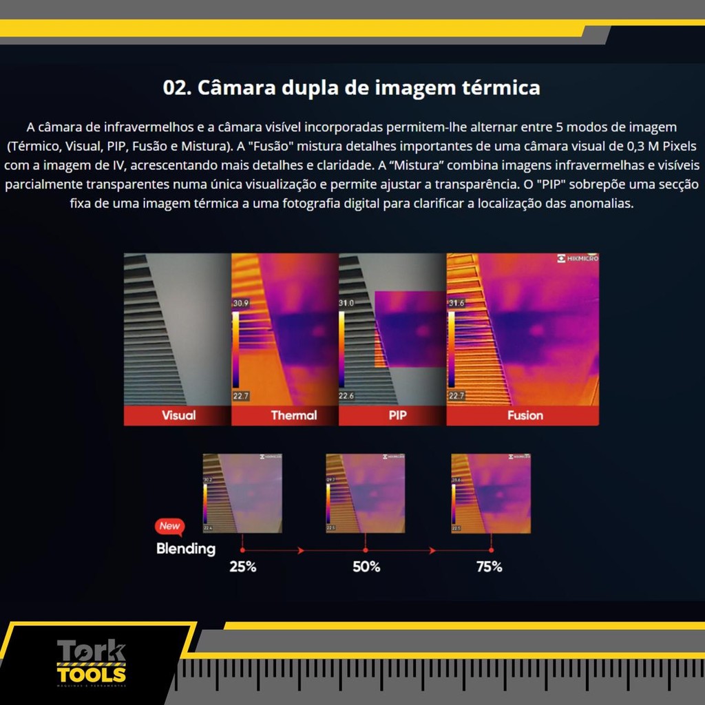 A PocketE HIKMICRO é uma câmera térmica portátil de alta precisão, ideal para inspeções em manutenção elétrica, hidráulica, predial e industrial. Com tecnologia SuperIR, melhora a resolução térmica para 240 × 240 pixels, garantindo imagens mais nítidas. Seu sensor duplo permite alternar entre cinco modos de imagem, enquanto a lente de ângulo amplo de 50° facilita a análise de grandes áreas. Possui medição térmica precisa (-20°C a 350°C), tela sensível ao toque de 3,5”, Wi-Fi integrado para compartilhamento rápido e armazenamento interno de 4GB, suportando até 30.000 imagens ou 20 horas de vídeo. Compacta e leve, cabe no bolso e é perfeita para profissionais exigentes. Principais Características * Tecnologia SuperIR – Aumenta a resolução térmica para 240 × 240 pixels, proporcionando imagens mais detalhadas. * Câmera dupla – Sensores térmico e visível permitem alternar entre cinco modos de imagem: térmico, visual, PIP, fusão e mistura. * Lente de ângulo amplo de 50° – Permite inspecionar grandes áreas rapidamente e identificar problemas como vazamentos de água e falhas na isolação térmica. * Medição térmica precisa – Mede temperaturas de -20°C a 350°C (-4°F a 752°F), com precisão de ±2°C ou ±2% da leitura. * Conectividade sem fio – Wi-Fi integrado para transferência de imagens e compartilhamento instantâneo via aplicativo HIKMICRO Viewer. * Level & Span com 1 Toque – Ajuste rápido do contraste para destacar possíveis problemas térmicos. * Armazenamento integrado de 4GB – Capacidade para até 30.000 imagens ou 20 horas de vídeo MP4. * Modo de gravação e reprodução – Captura e análise de dados diretamente no dispositivo. Especificações Técnicas - Resolução térmica: 240 × 240 pixels (com SuperIR) - Modos de imagem: Térmico, Visual, PIP, Fusão e Mistura - Faixa de temperatura: -20°C a 350°C (-4°F a 752°F) - Precisão de medição: ±2°C ou ±2% da leitura - Tela: LCD sensível ao toque de 3,5” - Campo de visão: 50° - Frequência de imagem: 25 Hz - Armazenamento interno: 4GB eMMC - Capacidade de armazenamento: Até 30.000 imagens ou 20 horas de vídeo MP4 - Conectividade: Wi-Fi para transferência de arquivos e compartilhamento - Bateria: Recarregável de íons de lítio Itens Inclusos Câmera térmica PocketE HIKMICRO Bolsa de transporte Cabo USB 2 em 1 (USB-A-C para USB-C) Correia de pulso A PocketE HIKMICRO é a escolha ideal para profissionais que buscam uma solução eficiente, portátil e acessível para diagnósticos térmicos de alta precisão. Marca: Hikmicro Modelo: PocketE