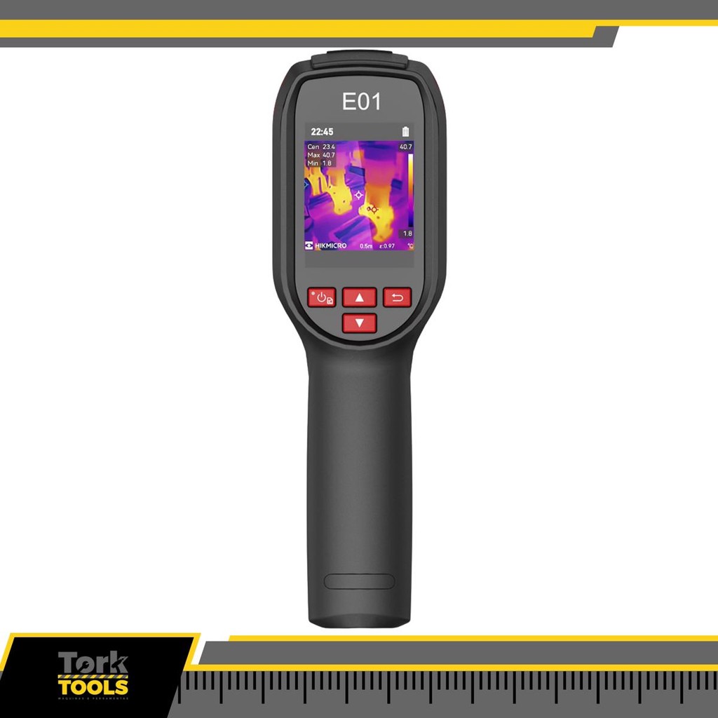 Câmera Térmica Portátil Hikvision E01 IP54 – Precisão Térmica de -20°C a 400°C com Resolução SuperIR A Câmera Térmica Portátil E01 da Hikvision foi desenvolvida para profissionais que exigem alta precisão na detecção de variações térmicas. Compacta, robusta e com proteção IP54, é ideal para aplicações industriais, manutenção elétrica, inspeções prediais e muito mais. Com resolução térmica de 96 x 96 pixels (9.216 pixels) e tecnologia SuperIR de até 240 x 240 (57.600 pixels), ela entrega imagens nítidas e detalhadas. Além disso, seu ponteiro laser integrado facilita a identificação do ponto de medição, enquanto sua memória interna de 4GB permite o armazenamento de até 30.000 imagens térmicas. Destaques do Produto Resolução térmica de 96 x 96 pixels Tecnologia SuperIR com resolução aprimorada de 240 x 240 Faixa de medição de temperatura de -20°C a 400°C Frequência de imagem de 20 Hz para captação fluida Alarme de cor, ponto quente e ponto frio Ponteiro laser e tela LCD de 2,4” com resolução de 240 × 320 Operação contínua por até 8 horas Proteção IP54 e resistência à queda de até 2 metros Interface USB-C e compatibilidade com tripé UNC ¼”-20 Características Técnicas Medição e Precisão: Faixa de temperatura: -20°C a 400°C Precisão: ±2°C ou ±2% Sensibilidade térmica (NETD):