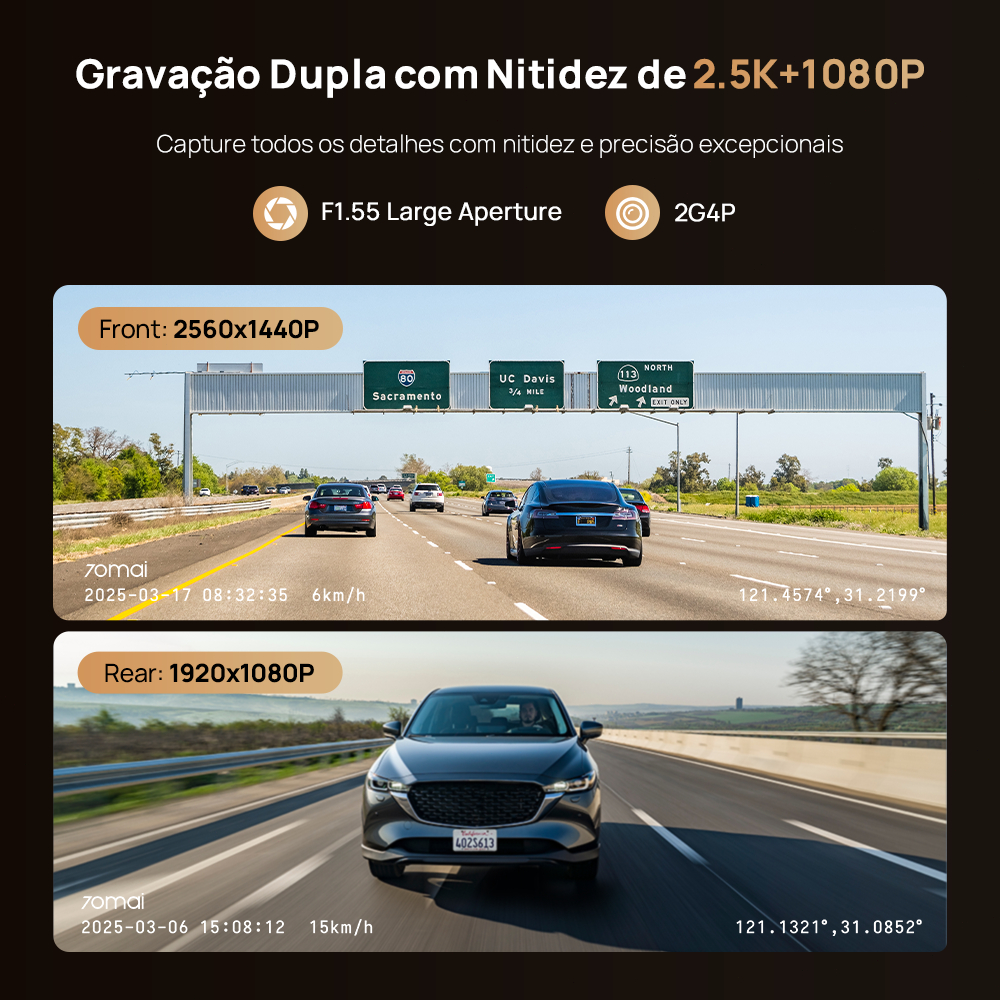 2025 Novo modelo 70mai Dashcam A410 [Especificação do modelo: A410: Versão com câmera frontal única] [Especificação do modelo: A410-1: Versão com câmera dupla (frontal A410 + traseira RC21)] Observação: confirme o modelo específico antes de fazer seu pedido. �� Características do produto �� A gravação HD com duas câmeras 2.5K + 1080P captura detalhes complexos com uma nitidez de imagem excecional Visão noturna superior + HDR de nível de hardware combinado com abertura F1.55 proporciona imagens noturnas mais brilhantes; a tecnologia 2G4P garante imagens mais nítidas e limpas Vigilância de estacionamento 24 horas: suporta gravação em lapso de tempo com detecção de colisão por sensor G integrado, proporcionando proteção contínua para o seu veículo (requer o uso de cabos redutores de tensão UP03/UP06) GPS integrado: suporta GPS, Galileo, GLONASS e QZSS. Grava rotas de condução em tempo real, velocidade e dados de localização para registo das condições da estrada, verificação da quilometragem e preservação de provas de condução com carimbo de data/hora. Gravação de emergência em buffer: bloqueia independentemente imagens críticas, preservando até 3 minutos (pré-colisão) + 30 segundos (pós-colisão) de vídeo de emergência. Linha do tempo de gravação em loop: quando o armazenamento está cheio, a gravação em loop sobrescreve automaticamente as imagens mais antigas. Os arquivos com registro de data e hora permitem uma navegação precisa na linha do tempo. Controle inteligente por aplicativo: visualize vídeos sem fio pelo celular ou conecte-se diretamente a um computador para transferência instantânea — sem necessidade de rede ou leitor de cartão. �� Especificações do produto �� Modelo: 70mai Dashcam A410 Resolução: 2560×1440 (2,5K) Abertura: F1,55 Taxa de quadros: 30 quadros por segundo Campo de visão: grande angular de 125° Tela: 2" Alta faixa dinâmica (HDR): compatível Tipo de bateria: pilha botão Suporte de armazenamento: 32 GB–256 GB Contagem de pixels: 3,5 MP (tipo de interface: tipo C) Especificações da RC21 traseira: (Incluída apenas no kit de câmera dupla) Sensor de imagem: GC2053 Taxa de quadros: 25 fps Resolução: 1080P Lente/Abertura: F2.0/2G2P Campo de visão: 130° Comprimento do cabo: 5,5 m + 0,5 m = 6 m (interface Tipo C) Posição de montagem: Para-brisa traseiro, voltado para fora HDR: Não compatível Interface: Interface Tipo C �� Conteúdo da embalagem �� 1 × Unidade de câmera frontal A410 1 × Câmera traseira RC21(apenas kit de câmera dupla) 1 × Suporte de montagem 1 × Cabo de alimentação 1 × Cabo de conexão da câmera traseira (apenas kit de câmera dupla) 1 × Carregador veicular tipo C de porta única 2 × Folhas antiestáticas transparentes 2 × Adesivos (pré-aplicados no suporte) 1 × Manual do usuário Termos da garantia 1. O produto é 100% original. A câmera para painel vem com garantia de 1 ano. 2. Para quaisquer outras dúvidas/solicitações pós-venda, entre em contato conosco a qualquer momento.