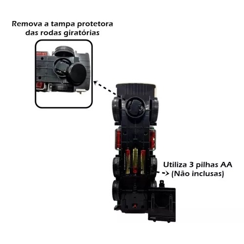 Descrição Medidas Aproximadas: --> 12 cm de altura --> 08 cm de largura --> 25 cm de comprimento Características: --> Possui luzes 3d --> Possui som --> Necessita de 3 pilhas do tipo AA (Não inclusas) --> Rotação 360°
