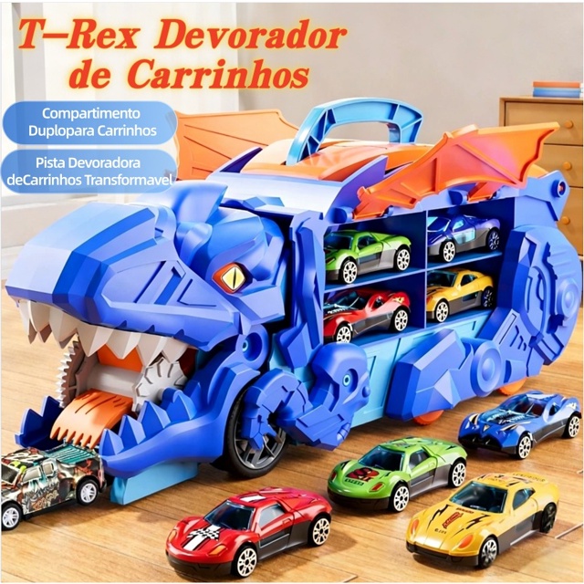 Caminhão Dinossauro T-Rex Engole Carrinhos 4 Carros Metal Transformável Pista Rampa Brinquedo Infantil