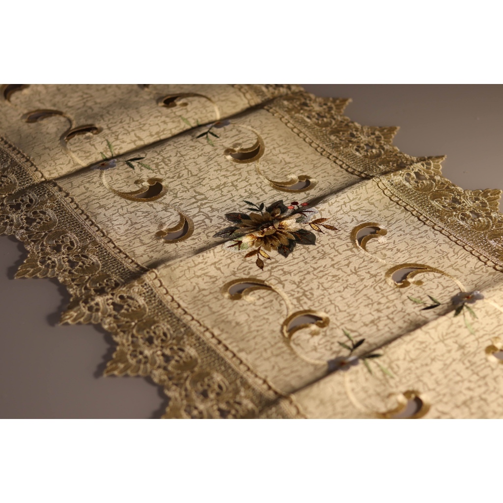 Caminho de mesa em tecido Bordado com Flores e detalhes de Renda Guipir (Cor bege)