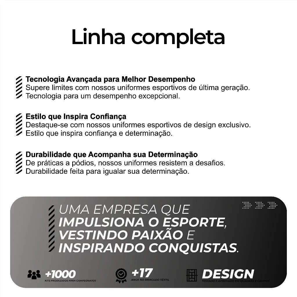 Material da Camiseta - Dry Fit Premium - 94,5% Poliéster / 5,5% Elastano com estampa em Sublimação Total; - Malha Air Dry - Tecido "furadinho" permitindo melhor transpiração ao atleta e não absorve suor. - Processo de Estampa : Sublimação Total ( Alta resolução ); - Proteção UV50+; - Quantidade : O valor do Anuncio Refere-se a UMA UNIDADE Alta qualidade na estampa. Dry Fit Premium: - É mais fresco - Retém menos líquido nas fibras e aumenta o desempenho nas atividades físicas. - A combinação de materiais na construção da Fibra determina nosso produto com uma proteção UV 50+, tratamento Antibacteriano - Maior durabilidade para prática de esportes ao ar livre. - Pode ser passada a ferro, não desbota ao lavar. Medidas da camisa: Camisa: P - Largura: 45cm / Altura: 59cm / Manga: 17cm; M - Largura: 47cm / Altura: 61cm / Manga: 18cm; G - Largura: 49cm / Altura: 64cm / Manga: 19cm; - Os Tamanhos estão em centímetros; - Os tamanhos podem variar em até 4%. Studio Sports. A Marca que Impulsiona Campeões.