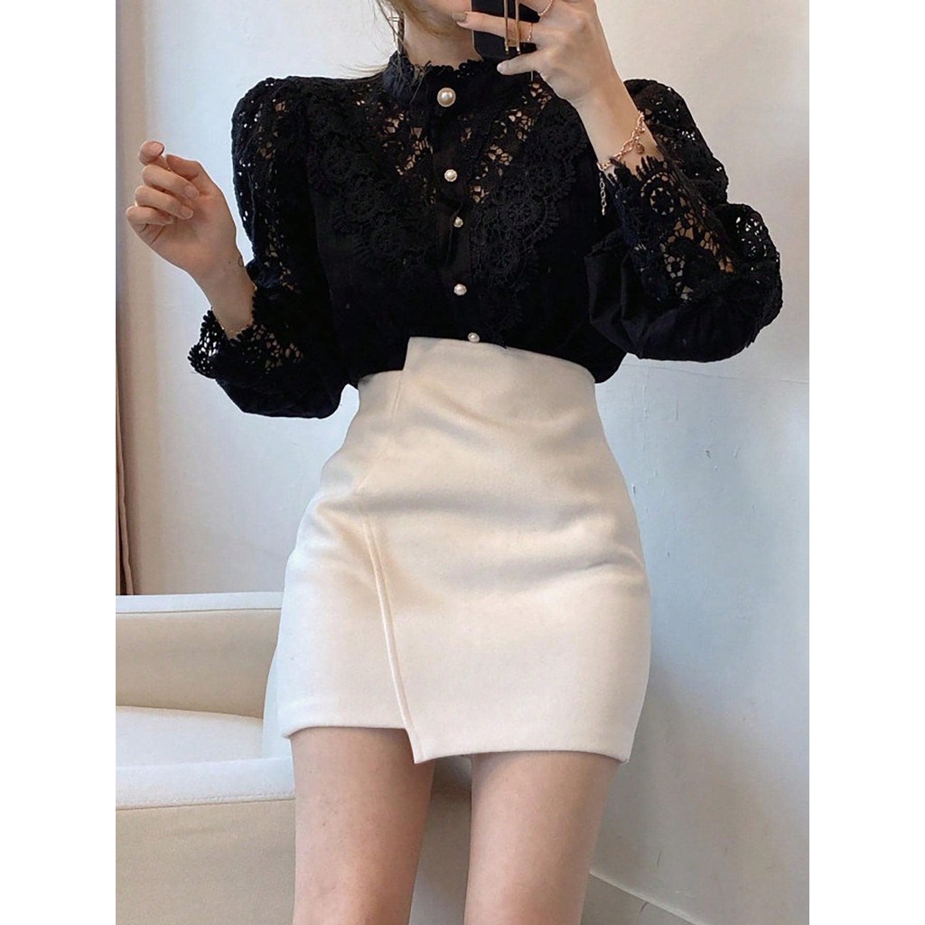 Camisa Botão Oco Out Feminina De Stand Collar Blusas De Renda Carnaval