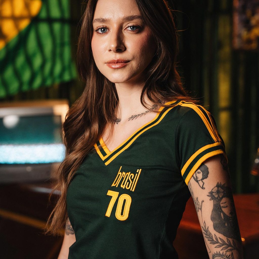 Uma homenagem direta à era mais lendária do futebol brasileiro. A Camiseta Brasil 70 Retrô Feminina traduz o espírito dos anos 70 em um design clássico, elegante e atemporal — feita para quem vive o futebol com identidade e estilo. Produzida em algodão macio de alta qualidade, essa peça oferece conforto extremo no uso diário, com toque suave e excelente respirabilidade. O bordado “Brasil 70” aplicado no peito reforça o caráter histórico da camisa, trazendo textura, durabilidade e acabamento premium. O decote em V com ribana contrastante e os detalhes nas mangas resgatam fielmente o visual das camisas vintage, enquanto o caimento feminino garante um visual moderno, equilibrando nostalgia e atitude. Benefícios do Produto: - Algodão macio premium: conforto absoluto para o dia a dia - Bordado de alta durabilidade: não desbota, não racha e não descasca - Estética retrô anos 70: inspiração direta na fase mais icônica do Brasil - Caimento feminino ajustado: valoriza o corpo sem apertar - Versátil: combina com jeans, alfaiataria casual ou looks urbanos - Acabamento Retrôgol: padrão elevado de qualidade e atenção aos detalhes Modo de Lavagem e Conservação: - Para preservar sua peça por muito mais tempo: - Lavar à mão ou na máquina em ciclo delicado - Utilizar água fria - Lavar do lado avesso - Não usar alvejante - Não secar em tambor - Secar à sombra Passar em temperatura baixa, sem passar diretamente sobre o bordado Esses cuidados mantêm a cor, o tecido e o bordado sempre impecáveis. Medidas Aproximadas: (A X L) - P: 58 x 42 cm - M: 61 x 44 cm - G: 62 x 45 cm - GG: 64 x 48 cm _ ALGODÃO NOBRE Tecido Macio e Confortável Modelagem Regular Formação do fio que se dá através de um efeito felpudo em apenas uma face. Possui toque macio e confortável, conta com um acabamento especial, o tecido passa por um processo de lixamento, deixando o toque mais delicado e suave.