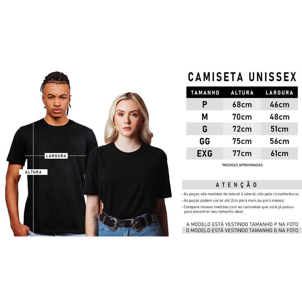 DESCRIÇÃO DO PRODUTO: ⭐ Camisa tradicional (unissex) ⭐ Blusa feminina ( babylook) ⭐ Tecido 100% Poliéster (Secagem Rápida, Não Desbota, Não Encolhe, Não Amassa) ⭐ Leve, confortável ( Excelente Custo Benefício) ⭐ Estampa em Serigrafia ( Silk) *** Confira a tabela de medidas antes de finalizar a compra, lembrando que as mesmas podem variar em até 2 cm para mais ou para menos. ***** TABELA DE MEDIDAS ***** (NÃO EFETUAMOS TROCAS POR TAMANHOS DEVIDO A CUSTO DE FRETE. FAVOR CONFERIR COM ATENÇÃO) UNISSEX P - Largura 46 cm x Comprimento 62 cm UNISSEX M - Largura 48 cm x Comprimento 68 cm UNISSEX G - Largura 54 cm x Comprimento 70 cm UNISSEX GG - Largura 58 cm x Comprimento 73 cm BABYLOOK P - Largura 38 cm x Comprimento 52 cm BABYLOOK M - Largura 40 cm x Comprimento 56 cm BABYLOOK G - Largura 44 cm x Comprimento 58 cm BABYLOOK GG - Largura 50 cm x Comprimento 60 cm Siga nossa loja para acompanhar as novidades e não perder as promoções!