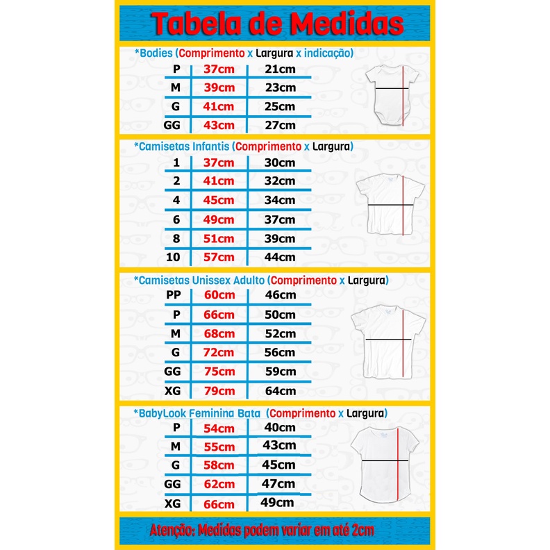 A estampa é somente na frente da camisa. Informe os TAMANHOS que precisa via CHAT (e outros dados para personalizar) ATENÇÃO: Confira Nossa TABELA DE MEDIDAS na última foto do anúncio, Por nosso produto ser confeccionado somente após o pedido, Nós não efetuamos trocas devido a erro na escolha do tamanho. TAMANHOS DISPONÍVEIS: - Bodies* (comprimento x largura) P - 36cm x 21cm (0-3 meses) M - 37cm x 23cm (3-6 meses) G - 38cm x 25cm (6-9 meses) GG - 40cm x 27cm (9-12 meses) - Camisetas Infantis* (comprimento x largura) 1 - 37cm x 30cm 2 - 41cm x 32cm 4 - 45cm x 34cm 6 - 49cm x 37cm 8 - 51cm x 39cm 10 - 57cm x 44cm 12 (PP adulto) - 60cm x 46cm - Camisetas Trad. Unissex Adulto* (comprimento x largura) P - 66cm x 50cm M - 68cm x 52cm G - 72cm x 56cm GG - 75cm x 59cm XG - 79cm x 64cm - Baby Look tipo bata Feminina Adulto* (comprimento x largura) P - 54cm x 41cm M - 56cm x 44cm G - 59cm x 46cm GG - 62cm x 48cm XG - 65cm x 50cm