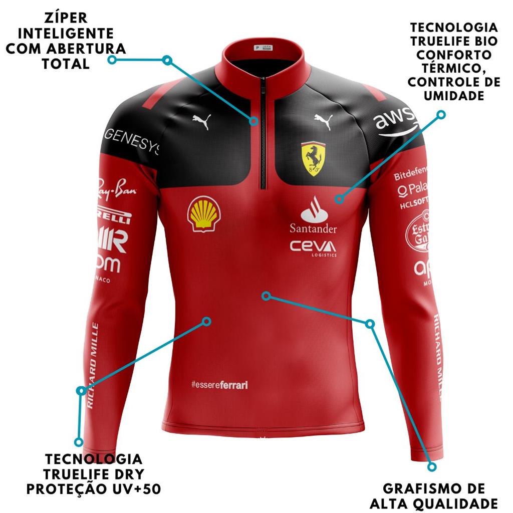 Camisa Ciclismo Camiseta Ciclista Roupa de Ciclismo Masculina Manga Longa Ferrari F1 Com Bolsos UV 50+