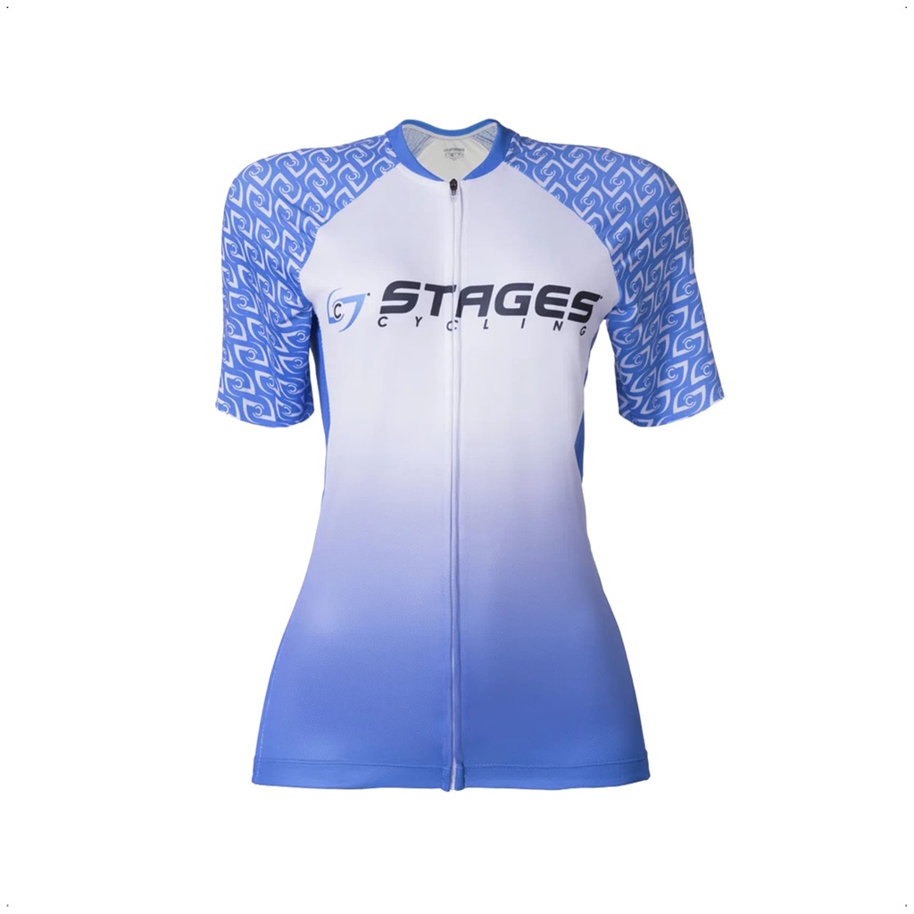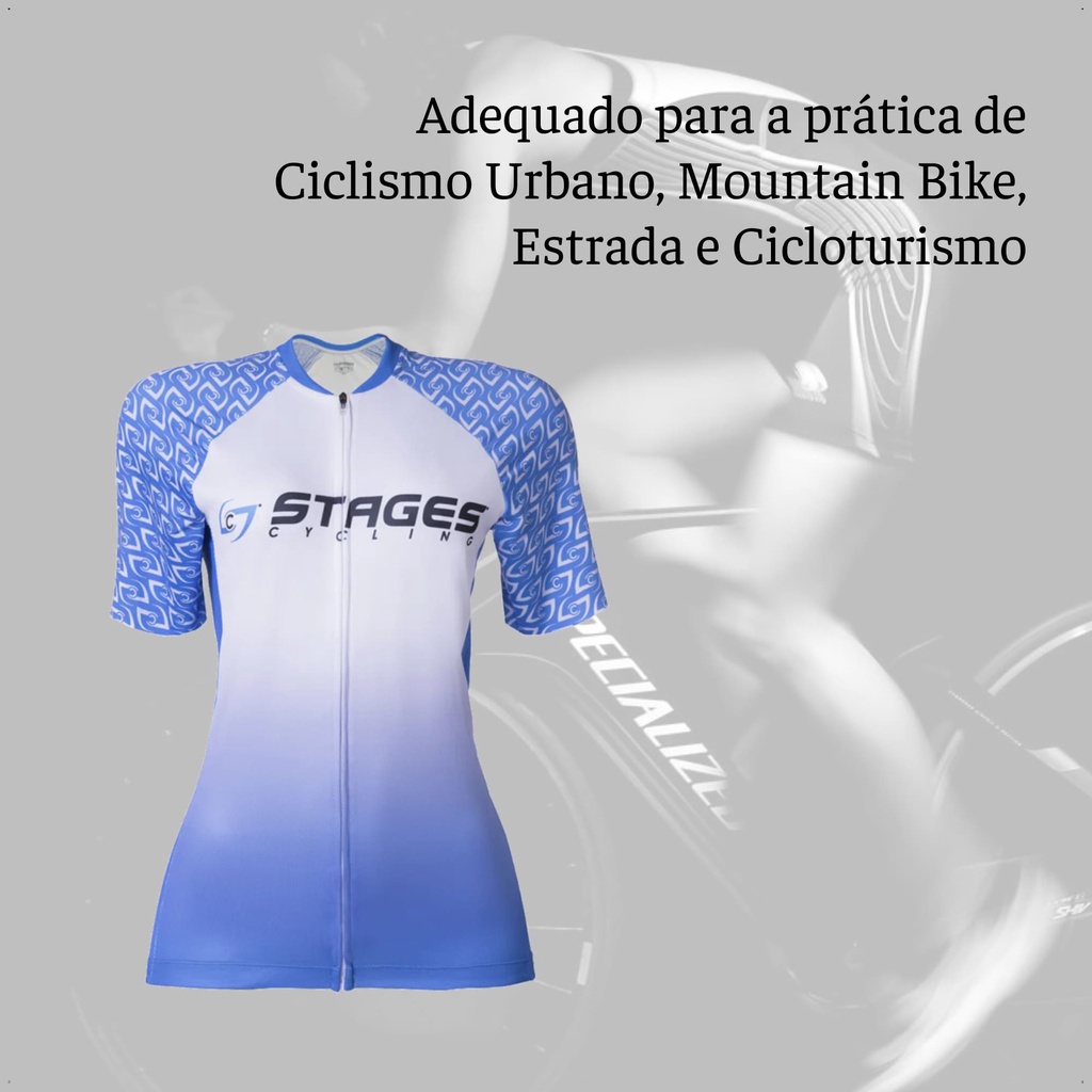 Camisa Ciclismo Feminina M Zíper Bolso Traseiro Degrade Branca e Azul Corrida Treino Academia Musculação Atrio VB048