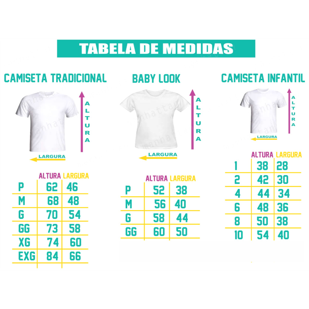 DESCRIÇÃO DO PRODUTO: ⭐ Camisa tradicional (unissex) ⭐ Blusa feminina ( babylook) ⭐ Tecido 100% Poliéster (Secagem Rápida, Não Desbota, Não Encolhe, Não Amassa) ⭐ Leve, confortável ( Excelente Custo Benefício) ⭐ Estampa em Serigrafia ( Silk) *** Confira a tabela de medidas antes de finalizar a compra, lembrando que as mesmas podem variar em até 2 cm para mais ou para menos. ***** TABELA DE MEDIDAS ***** (NÃO EFETUAMOS TROCAS POR TAMANHOS DEVIDO A CUSTO DE FRETE. FAVOR CONFERIR COM ATENÇÃO) UNISSEX P - Largura 46 cm x Comprimento 62 cm UNISSEX M - Largura 48 cm x Comprimento 68 cm UNISSEX G - Largura 54 cm x Comprimento 70 cm UNISSEX GG - Largura 58 cm x Comprimento 73 cm BABYLOOK P - Largura 38 cm x Comprimento 52 cm BABYLOOK M - Largura 40 cm x Comprimento 56 cm BABYLOOK G - Largura 44 cm x Comprimento 58 cm BABYLOOK GG - Largura 50 cm x Comprimento 60 cm Siga nossa loja para acompanhar as novidades e não perder as promoções!