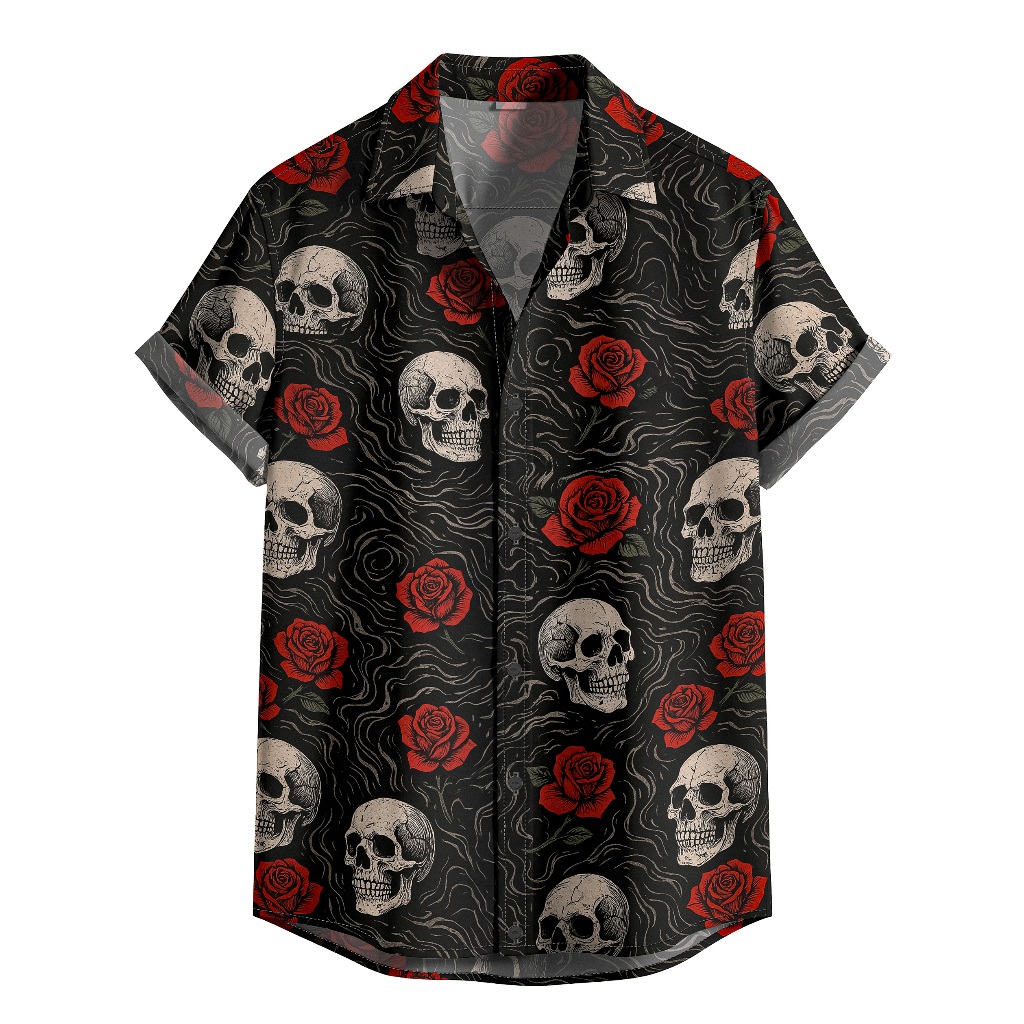 Camisa De Botão Preta Caveiras Rosas Floral De Caveira [Ref-110]