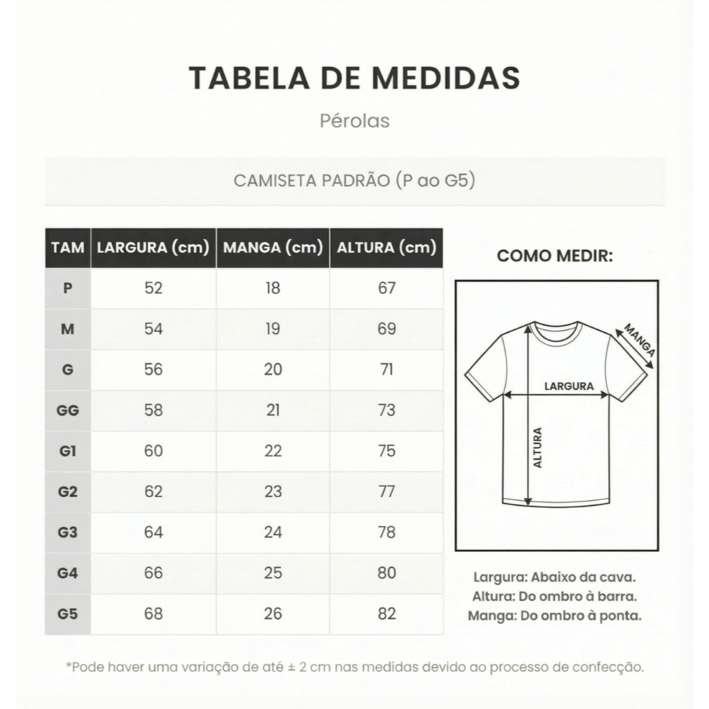 ✨ Seja bem-vindo(a)! Obrigado por visitar nosso anúncio. Aqui você encontra qualidade, agilidade no envio e um produto feito com muito cuidado do início ao fim. 🚚 ENVIO RÁPIDO E GARANTIDO - COMPRAS REALIZADAS ATÉ AS 11H SÃO ENVIADAS NO MESMO DIA - POSTAGEM EM ATÉ 1 DIA ÚTIL - Código de rastreamento enviado em até 24 horas úteis após a compra 📦 Assim que o pedido for postado, você receberá automaticamente o código para acompanhar a entrega. ⏰ ATENDIMENTO DISPONÍVEL 24 HORAS , ANTES E DEPOIS DA COMPRA 👕 DETALHES DA CAMISETA - Modelo: Camiseta Tradicional - Tecido: 100% Algodão - Confortável, macia e resistente - Ideal para uso diário 🖨️ SOBRE A ESTAMPA - Tipo de estampa: DTF (Direct to Film) - Impressão em alta definição aplicada por termo transferência - Excelente fixação ao tecido - Toque macio e flexível - Aparência semelhante ao silk screen - Alta durabilidade, cores vivas e resistência a lavagens (caso o modelo seja estampado) 📏 MEDIDAS DA CAMISETA (medidas em centímetros – cm) P Largura: 52 cm / Manga: 18 cm / Altura: 67 cm M Largura: 54 cm / Manga: 19 cm / Altura: 69 cm G Largura: 56 cm / Manga: 20 cm / Altura: 71 cm GG Largura: 58 cm / Manga: 21 cm / Altura: 73 cm G1 Largura: 60 cm / Manga: 22 cm / Altura: 75 cm G2 Largura: 62 cm / Manga: 23 cm / Altura: 77 cm G3 Largura: 64 cm / Manga: 24 cm / Altura: 78 cm G4 Largura: 66 cm / Manga: 25 cm / Altura: 80 cm G5 Largura: 68 cm / Manga: 26 cm / Altura: 82 cm 📌 Importante: - As medidas são tiradas com a peça fora do corpo - Pode haver variação de até 2 cm Recomendamos comparar com uma camiseta que você já tenha 💬 Dúvidas? Entre em contato pelo chat da Shopee. Estamos prontos para te atender!