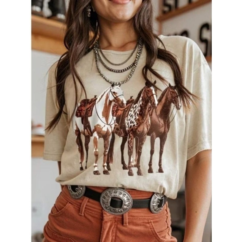 camisa Feminina Country com estampa de cavalos com reforço de ombros Gola Redonda Manga Curta Envio Imediato
