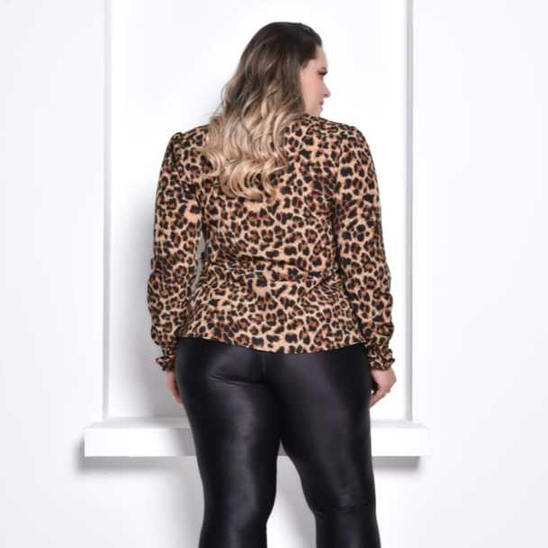 Camisa Feminina Plus Size Manga Longa de Oncinha Animal