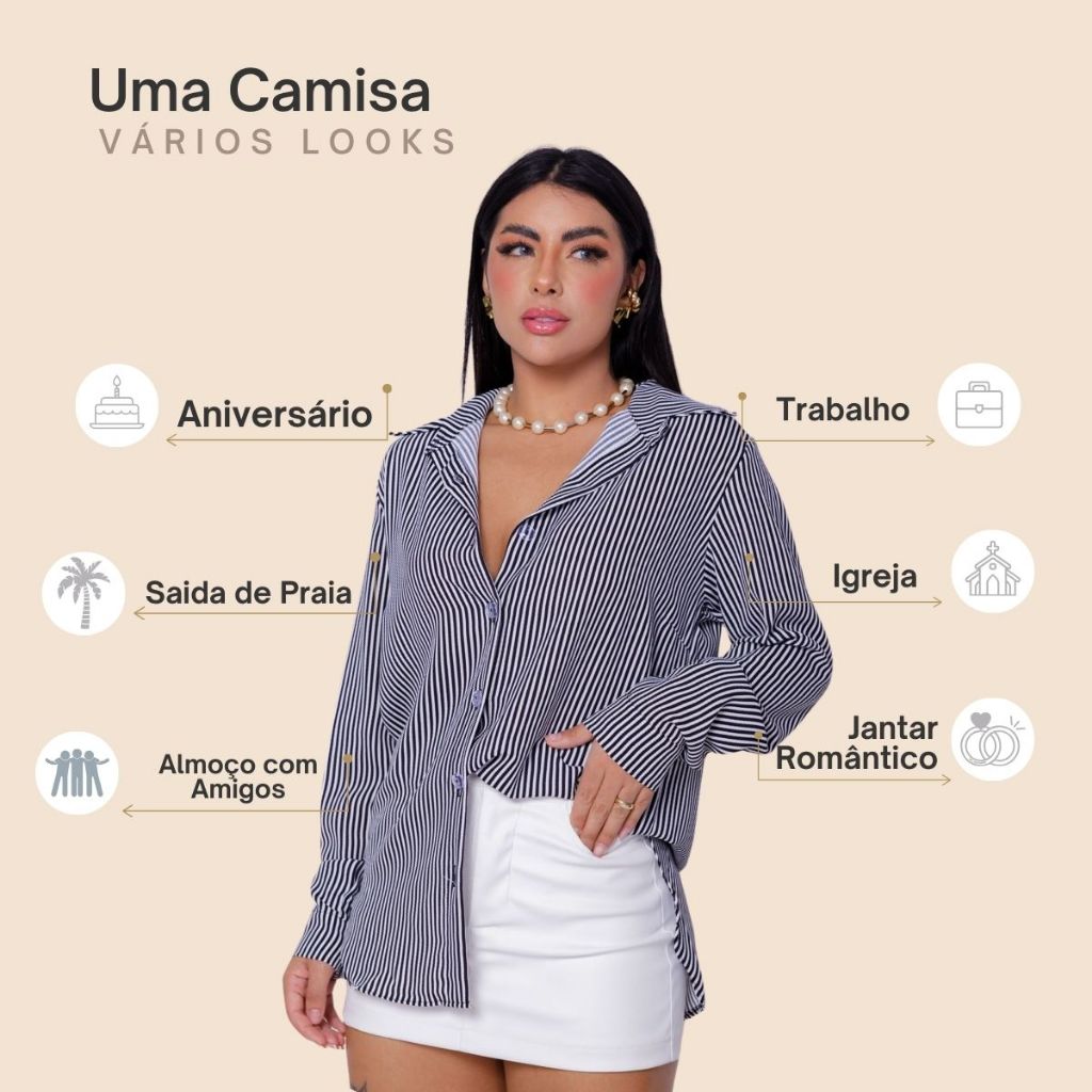 Camisa feminina social listrada, elegante e versátil, ideal para looks formais ou casuais. Possui botões funcionais na frente e nos punhos, caimento reto e modelagem com parte de trás levemente mais longa que a frente. Confeccionada em tecido crepinho, leve e confortável, com ótimo caimento no corpo. Composição: 92% Viscose, 8% Elastano. Tamanhos Disponíveis: P, M, G e GG Para informações de medidas, consulte a tabela. Qualquer dúvida estamos a disposição.