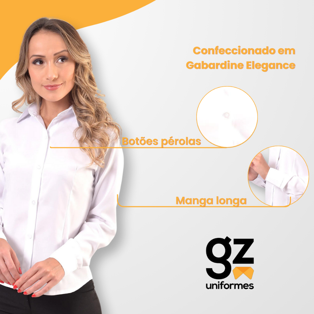 Quer uniformizar sua empresa? A GZ uniformes é a solução: QUEREMOS VESTIR SUA MARCA! • Há mais de 18 anos UNIFORMIZANDO equipes; • Somos loja de fábrica; • Com envio IMEDIATO • E compra garantida. Características essenciais para você que busca o distribuidor certo para os uniformes de sua empresa. LEIA AS PERGUNTAS FREQUENTES NO FINAL DA DESCRIÇÃO. TABELA DE MEDIDAS (cm): • PP » Ombro: 11cm / Busto: 93cm / Costas: 38cm / Cintura: 86cm / Quadril: 96cm / Comprimento: 59cm / Comp. Manga: 60cm; • P » Ombro: 11cm / Busto: 94cm / Costas: 39cm / Cintura: 90cm / Quadril: 96cm / Comprimento: 59cm / Comp. Manga: 60cm; • M » Ombro: 13cm / Busto: 102cm / Costas: 40cm / Cintura: 97cm / Quadril: 108cm / Comprimento: 63cm / Comp. Manga: 62cm; • G » Ombro: 13cm / Busto: 108cm / Costas: 42cm / Cintura: 104cm / Quadril: 116cm / Comprimento: 65cm / Comp. Manga: 64cm; • GG » Ombro: 14cm / Busto: 115cm / Costas: 45cm / Cintura: 110cm / Quadril: 126cm / Comprimento: 67cm / Comp. Manga: 64cm; • XGG » Ombro: 16cm / Busto: 118cm / Costas: 47cm / Cintura: 116cm / Quadril: 132cm / Comprimento: 72cm / Comp. Manga: 65cm; • G2 » Ombro: 16cm / Busto: 128cm / Costas: 49cm / Cintura: 122cm / Quadril: 142cm / Comprimento: 75cm / Comp. Manga: 66cm; • G3 » Ombro: 17cm / Busto: 132cm / Costas: 51cm / Cintura: 128cm / Quadril: 150cm / Comprimento: 77cm / Comp. Manga: 68cm; FICHA TÉCNICA: • Camisete Social Feminina Manga Longa; • Confeccionado em Gabardine Elegance; • Composição: 100% Poliéster; • Modelo: Social, com Manga Longa; • Cores: Branco, Preto e Azul Marinho; • Marca: GZ Uniformes; • Numerações: PP ao GG (Trabalhamos com tamanhos Plus Size); PERGUNTAS FREQUENTES: • VENDEMOS ATACADO? Sim. Somos uma empresa atacadista, com a GZ Uniformes quanto mais você compra, mais vantagens você tem! • QUAL NOSSO PÚBLICO PRINCIPAL? Somos uma empresa de uniformes profissionais, focada em uniformes administrativos e cozinha. • PRODUTO A PRONTA ENTREGA? Sim. Todos os nossos produtos estão disponíveis em estoque, enviados imediatamente após a confirmação do pagamento.