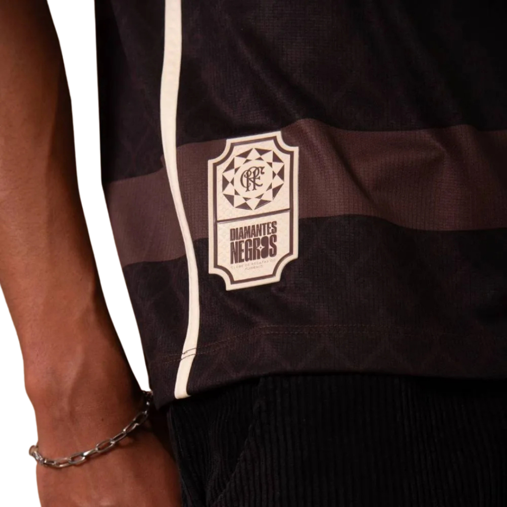 Criada em homenagem ao Dia da Consciência Negra, a camisa Diamantes Negros destaca a importância da população negra na trajetória do Flamengo, do futebol brasileiro e da cultura nacional. A nova estampa inspirada no sankofa, símbolo de origem africana que expressa a sabedoria de revisitar o passado para construir um futuro melhor. O lançamento faz parte das celebrações dos 130 anos do clube e a camisa traz uma alusão à data histórica. Tabela de Medidas aproximadas (Altura x Largura): 6A 50cm x 39cm 8A 54cm x 41cm 10A 58cm x 44cm 12A 62cm x 47cm 14A 66cm x 50cm