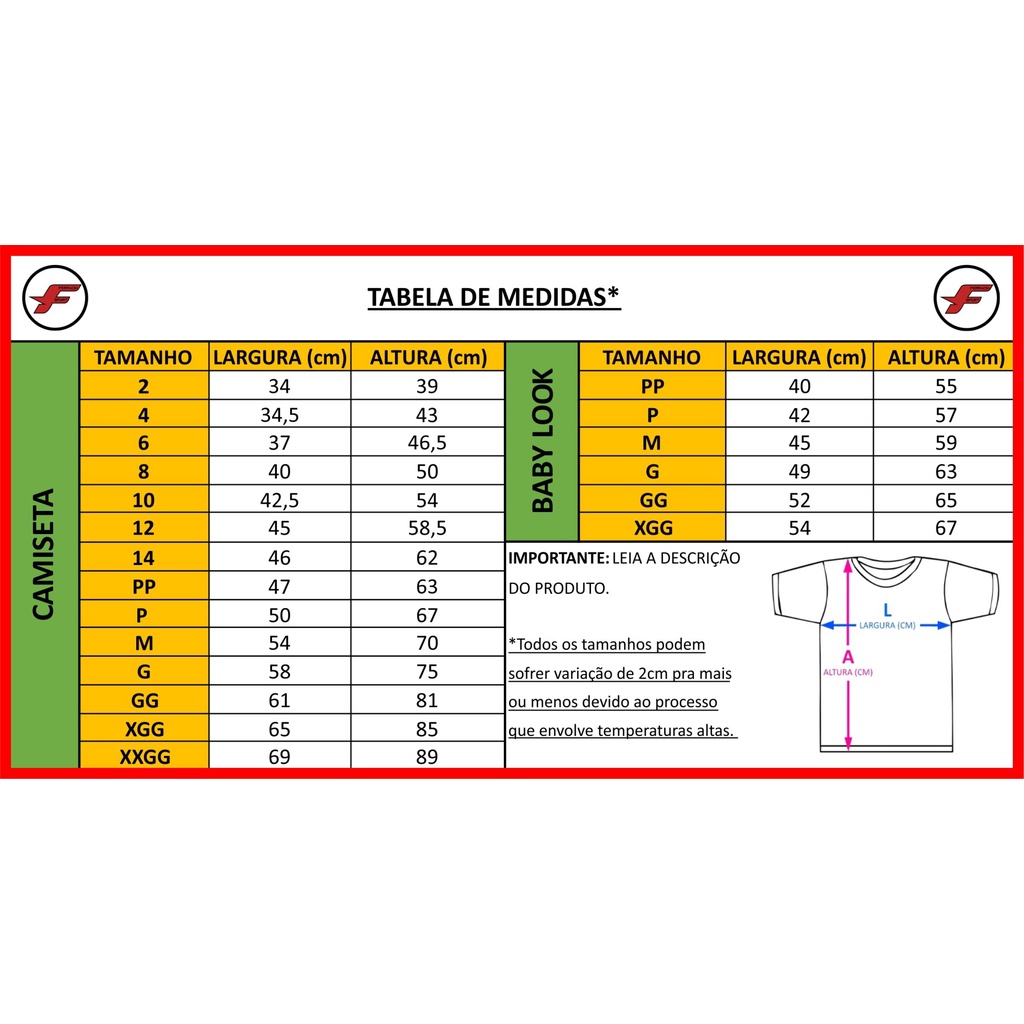 As camisetas personalizadas com NOME, devem nos ser passada a informação no chat, logo após a conclusão da compra. Caso não seja informado no prazo, será feita sem nome, devido ao nosso prazo de entrega da Shopee. TABELA DE MEDIDAS: TAMANHO | LARGURA (CM) | ALTURA (CM) ---------+------------------------+----------------------+------------------ 2 | 34 | 39 4 | 34,5 | 43 6 | 37 | 46,5 8 | 40 | 50 10 | 42,5 | 54 12 | 45 | 58,5 14 | 46 | 62 PP | 47 | 63 P | 50 | 67 M | 54 | 70 G | 58 | 75 GG | 61 | 81 XGG | 65 | 85 XXGG | 69 | 89 TIPO DE IMPRESSÃO: Sublimação Total equipamento de última tecnologia do mercado proporcionando camisetas de alta qualidade e cores vibrantes. As cores podem ter um pequena variação de acordo com a foto do anúncio. IMAGEM: O Posicionamento da imagem poderá ter uma pequena variação dependendo de cada tamanho escolhido, prezamos sempre por deixar o mais idêntico possível do modelo acima. TIPO DE COSTURA: Costura realizada por costureiras profissionais com mais de 20 anos de profissão, além disso são utilizadas maquinas industriais que proporciona maior resistência na costura, prolongando a vida útil da roupa por anos. PRIMEIRA LAVAGEM: Ao receber sua camiseta é muito importante lavar para remover as impurezas e goma (processo preparatório do tecido). Isso também fará com que a camiseta retorne a sua maciez original. ENVIO: Após a confirmação de sua compra teremos um prazo de 7 dias úteis para produção e postagem de seu produto, lembrando que sábados e domingos não contam. EMBALAGEM: Você receberá sua camiseta/produto em envelopes de segurança protegidos contra umidade e luz solar. POLITICA DA EMPRESA: A empresa Rita Bordados e Confecções Ferracin preza a qualidade acima de tudo, pois sabemos a importância de nossos clientes vestirem roupas confortáveis. TROCAS: Camisetas Personalizadas não podem ser trocadas. INFORMAÇÕES ADICIONAIS: CÓDIGO: Camiseta Person Free Fire MARCA: Ferracin Confecções TAMANHOS: Tabela de medidas descrito na foto do produto. Duvidas? consultar pelo chat/mensagem. COMPOSIÇÃO: - Frente: 100% Poliéster Dryfit; LAVAGEM: Lavagem normal (proíbido utilizar alvejante clorado).