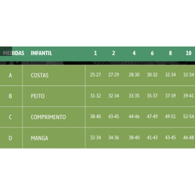 TAMANHO 2: manga comprimento: 34-36 cm Comprimento da camisa: 43-45 cm Costas/Ombro: 27-29 cm Peito: 32-34 cm só de frente para circunferência dobrar o valor. TAMANHO 4: manga comprimento: 38-40 cm Comprimento da camisa: 44-46 cm Costas/Ombro: 28-30 cm Peito: 33-35 cm só de frente para circunferência dobrar o valor. TAMANHO 6: manga comprimento: 41-43 cm Comprimento da camisa: 47-49 cm Costas/Ombro: 30-32 cm Peito: 35-37 cm só de frente para circunferência dobrar o valor. TAMANHO 8: manga comprimento: 43-45 cm Comprimento da camisa: 49-51 cm Costas/Ombro: 32-34 cm Peito: 37-39 cm só de frente para circunferência dobrar o valor. TAMANHO 10: manga comprimento: 46-48 cm Comprimento da camisa: 52-54 cm Costas/Ombro: 32-34 cm Peito: 39-41 cm só de frente para circunferência dobrar o valor.