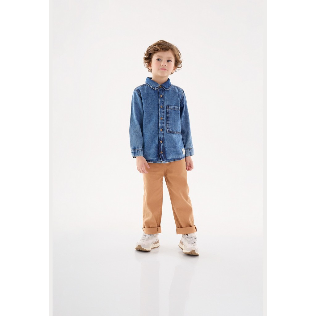 Camiseta infantil confeccionada em jeans com elastano, apresenta efeito de lavanderia, que confere um toque moderno e estiloso. Possui fechamento com botões e bolso que complementa o visual, proporcionando um charme extra.Tecido: JeansComposição: 100% AlgodãoModelagem: JustaComprimento Manga: LongaForro: NãoFechamento: Botões