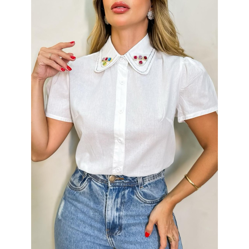 camisa manga curta feminina gola com detalhe modas W6247