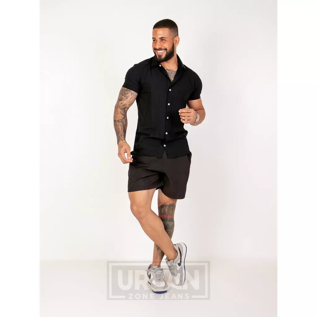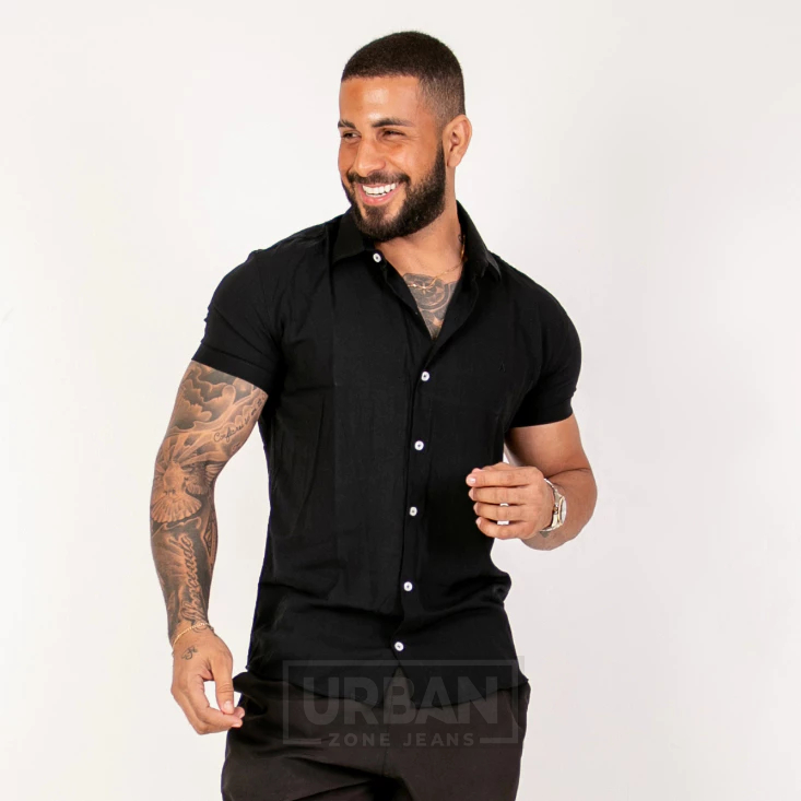 Camisa Masculina Linho Preta Manga Curta Slim Fit