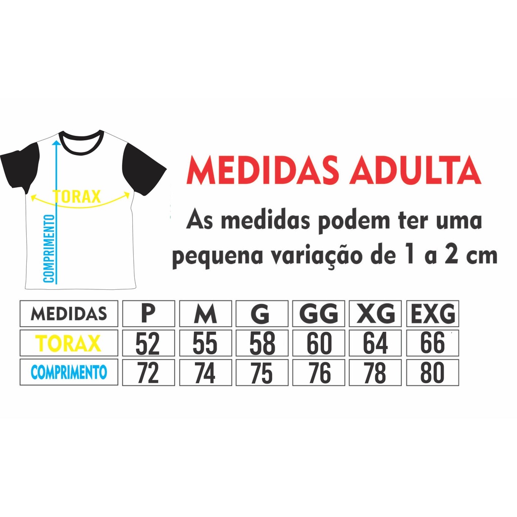 TAMANHOS DISPONIVEIS: P- M, -G - GG, -XG - EXG Caso tenha duvida em qual tamanho escolher entre em contato conosco ! ATENÇÃO após efetuar a compra o envio é feito em ate 3 dias uteis MATERIAL USADO PARA A PRODUÇÃO Dri-fit UV50 O que é uma camisa dry fit? As Camisetas Dry são fabricadas com malha de microfibra e tecnologia inteligente. Com elas, o suor excessivo se espalha rapidamente em uma área maior do tecido, garantindo uma evaporação mais eficiente, conforto e maior performance nas atividades e no uso casual