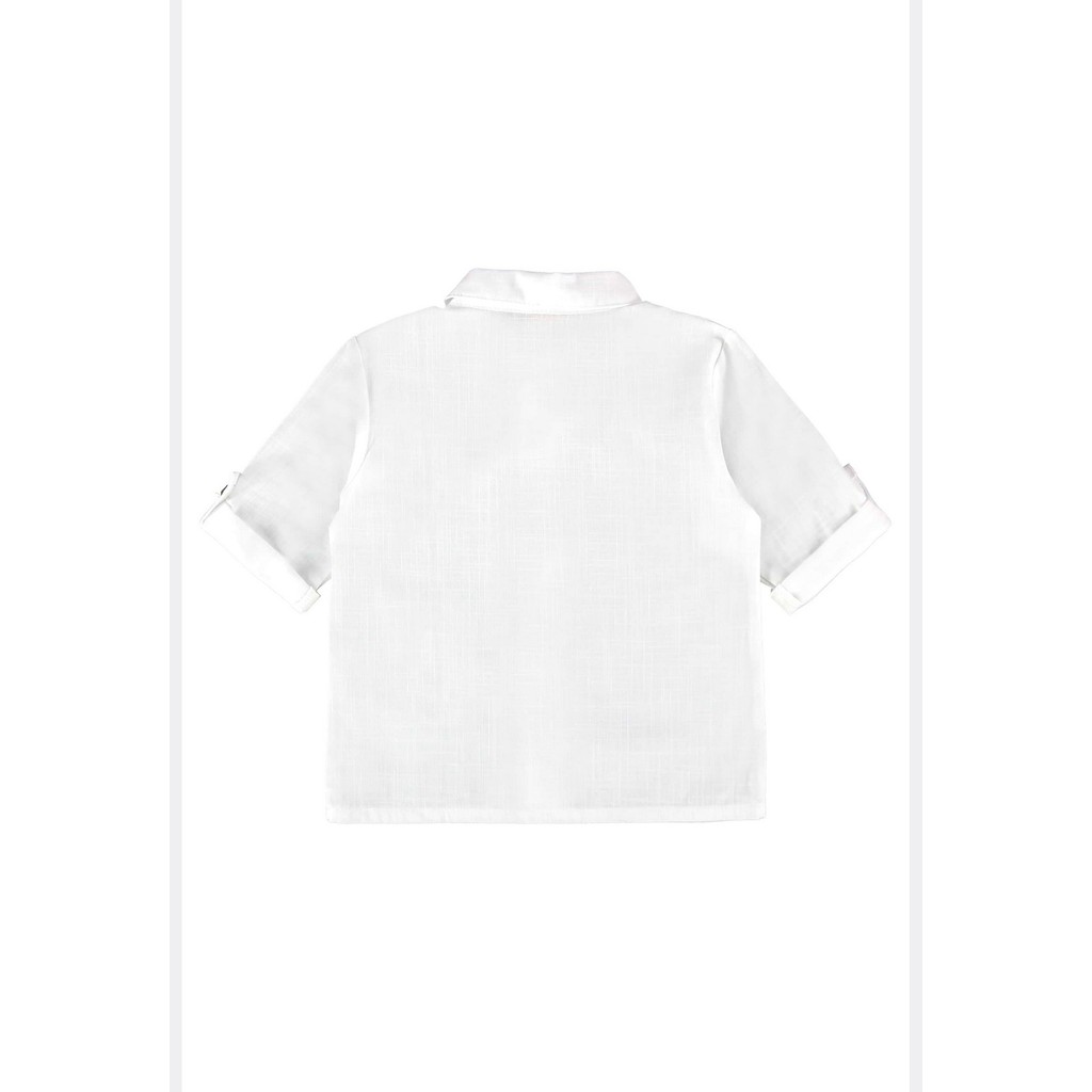 Camisa para bebê menino confeccionada em tecido voil, composto por algodão, proporcionando leveza e conforto. A peça tem tom branco, com gola e pé de gola falso, além de martingale nas mangas, que permite ajustar e prender as mangas. Possui fechamento por botões e caseados frontais, facilitando o vestir, e uma modelagem clássica que combina sofisticação e conforto.Tecido: Camisa: Tecido VoilComposição: 100% algodãoModelagem: AmplaComprimento Mangas: LongaForro: NãoDecote: RedondoFechamento: Botões