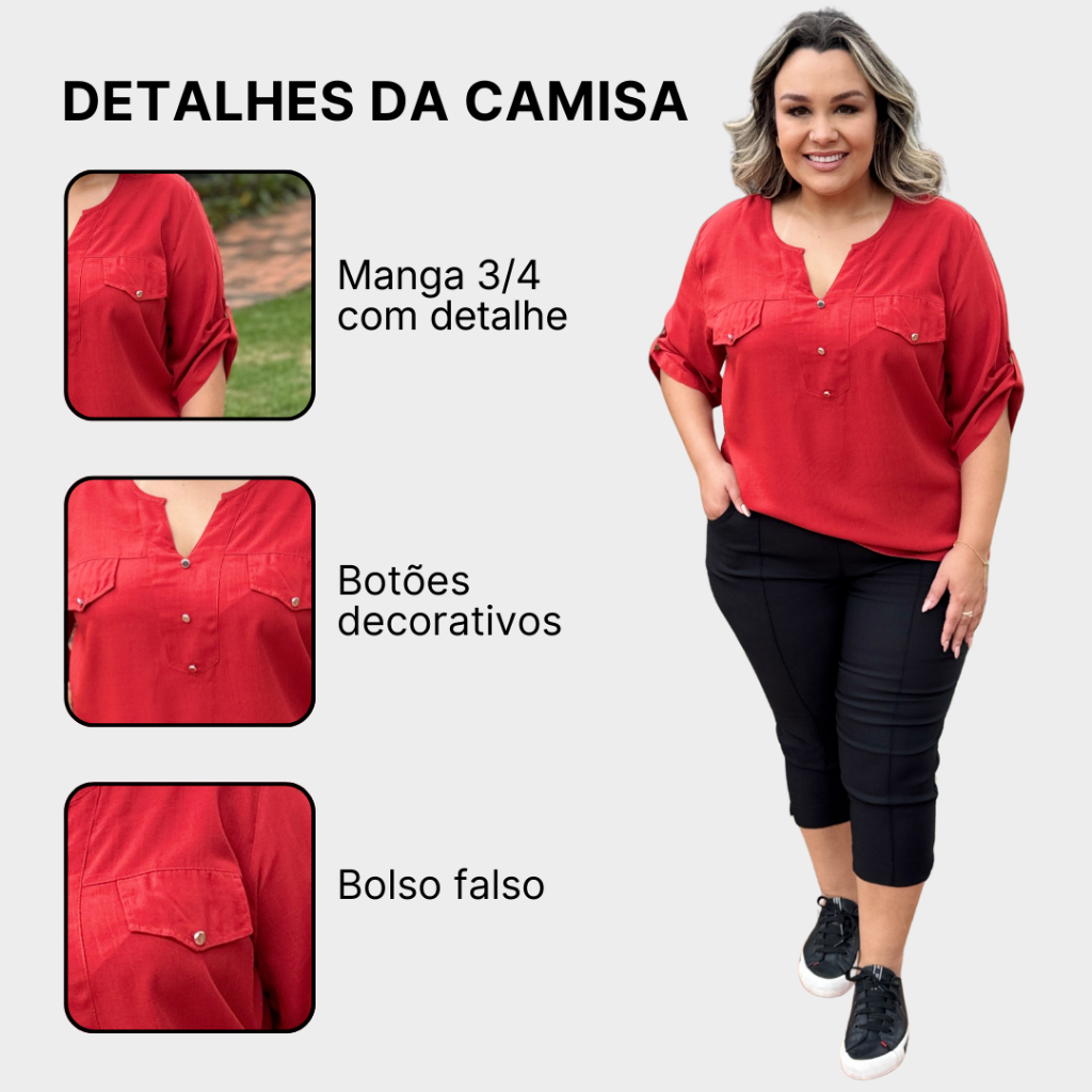 Camisa Plus Size Social Feminina Soltinha Elegante Lisa Manga 3/4 Camisa manga 3/4 em Viscolinho, perfeita para quem busca conforto e estilo em qualquer ocasião. Com tecido leve e sofisticado, possui um caimento impecável e um toque suave. Sem elasticidade, mas com ajuste confortável, é a escolha ideal para compor looks elegantes e versáteis. ✅Sobre o Produto ▪ Tecido: Viscolinho ▪ Composição: 55% Viscose, 45% Poliéster ✅ Tabela de Medidas TAMANHO G1 G2 G3 BUSTO 114cm 122cm 128cm QUADRIL 124cm 132cm 138cm COMPRIMENTO 70cm 72cm 74cm LARG. MANGA 50cm 53cm 56cm ❓O que é o tecido Viscolinho? O tecido Viscolinho é uma mistura de Viscose e Poliéster, unindo a leveza e maciez da viscose com uma textura rústica e sofisticada. Tem um toque suave, bom caimento e é muito fresquinho, ideal para dias quentes. Além disso, é um tecido respirável e elegante, perfeito para peças confortáveis e versáteis. 🚚Envio Super Rápido