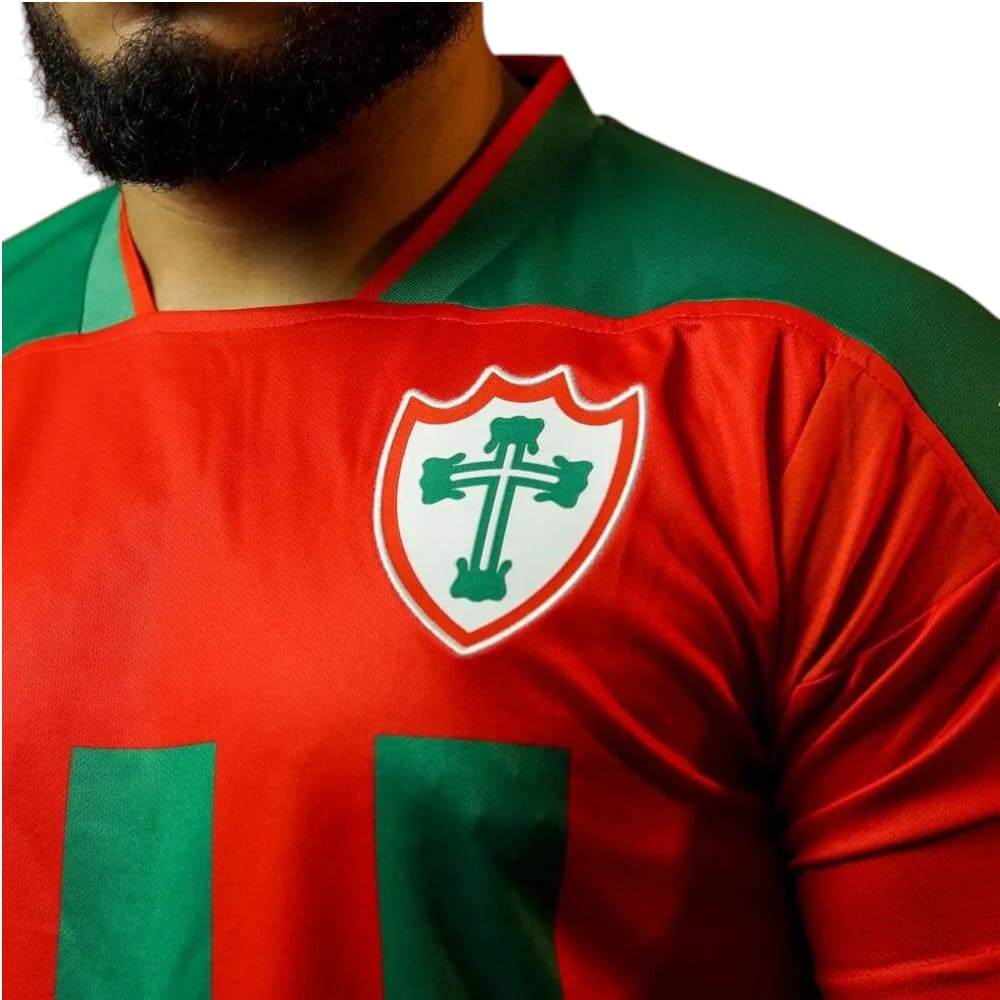 A linha oficial de jogo é confeccionada pela marca Joma , em um projeto exclusivo para a Portuguesa . Logo Joma nas mangas Tecido Mesh 100% Poliéster Gênero: Masculino Marca: Joma Cor: Vermelho e Verde Dimensões aproximadas (A x L): P:71 x 48 cm M:72 x 50 cm G:74 x 51 cm GG:75 x 54 cm 2GG:77 x 61 cm 3GG: 79 x 66 cm 4GG: 80 x 72 cm