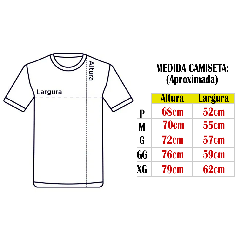 Ótima camiseta, possui tecido com toque macio e acabamento super confortável. Nossas estampas são de altíssima qualidade, podendo lavar que não desbota, não desmancha. Camiseta 100% poliester ATENÇÃO: As medidas podem variar um pouco MEDIDAS: (ALTURA X LARGURA) P - 68cm x 52cm M - 70cm x 55cm G - 72cm x 57cm GG - 76cm x 59cm XG - 79cm x 62cm