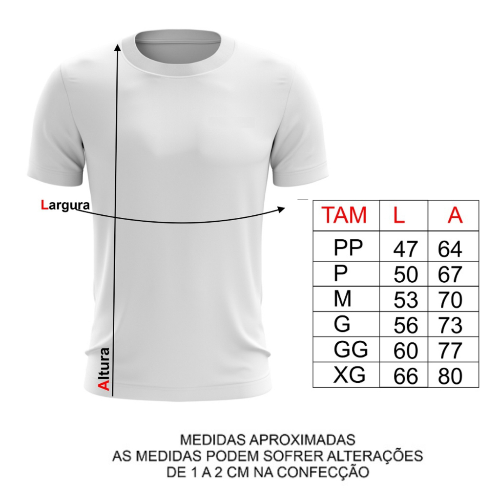 TECIDO Dry Fit 100% poliéster Tecido com proteção UV e proteção antibacteriana. Não confeccionamos camisas em Algodão. Se precisa personalizar uma camisa, entre em conta conosco pelo chat. Teremos o prazer de lhe atender! CONFECÇÃO Nossas peças são confeccionadas com costura de ponto duplo, garantindo assim uma durabilidade maior nas costuras de nossos produtos. ATENÇÃO Verificar o tamanho da camisa antes de finalizar a compra, tempos uma tabela de tamanho na galeria de fotos do produto. Qualquer dúvida entre em contato conosco através do chat. Teremos o prazer de tirar todas as suas dúvidas. A resolução do seu monitor pode interferir na percepção do tom das cores da camisa e estampa.