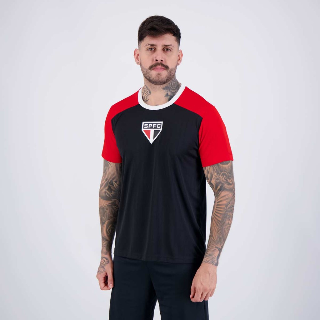 Composição: 100% Poliéster Cor predominante: Preto Indicada para: Casual Escudo: Estampado Gênero: Masculino Origem: Nacional Clube: São Paulo Manga: Curta Gola: Careca Dimensões Aproximadas (A x L): P: 70 x 53 cm M: 72 x 55 cm G: 74 x 57 cm GG: 76 x 59 cm