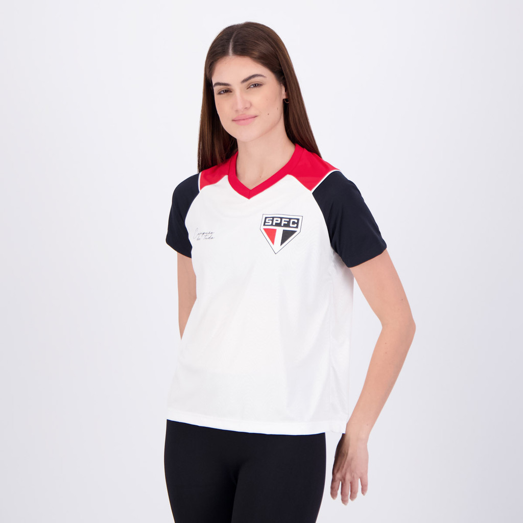 Composição: 100% PoliésterCor predominante: BrancaIndicado para: CasualEscudo clube: EstampadoGênero: FemininoLayout: Camisa com padrão de listras onduladas em relevo, gola V vermelha e detalhe escrito em preto na parte frontal.Origem: NacionalClube: São PauloManga: CurtaGola: VModelagem: Regular Dimensões aproximadas (A x L):P: 58 x 46 cmM: 65 x 52 cmG: 68 x 53 cmGG: 71 x 58 cm