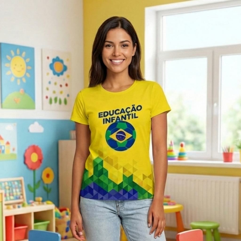 # 🇧🇷 Camiseta Brasil Edição Especial - Professora & Educação Mostre seu amor pela educação e pelo Brasil com nossas camisetas exclusivas! Desenvolvidas especialmente para a rotina escolar, unindo conforto, estilo e praticidade. **✨ POR QUE ESCOLHER NOSSA CAMISETA?** * **Tecido Inteligente:** Não precisa passar, não encolhe e seca super rápido. * **Estampa Digital:** Sublimação total que não desbota nunca, mantendo as cores vivas. * **Conforto:** Malha respirável e com alta elasticidade. * **Zero Transparência:** Sinta-se segura no ambiente de trabalho. **📏 TABELA DE MEDIDAS (Aproximada):** Confira a imagem da tabela no anúncio para garantir o caimento perfeito! * **P (34/36):** Busto 38cm | Altura 52cm * **M (38/40):** Busto 44cm | Altura 56cm * **G (42):** Busto 48cm | Altura 58cm * **GG (44):** Busto 51cm | Altura 64cm **🎨 MODELOS DISPONÍVEIS:** 1. **Educação Infantil:** Com bola e cores vibrantes. 2. **Educação:** Com brasão estilizado. 3. **Professora:** Design moderno com degradê. **📦 O QUE VEM NO PACOTE:** * 01 Camiseta Temática Brasil (Modelo à sua escolha). ✅ **Envio Imediato** | **Compra Segura** | **Garantia de Qualidade** _Garanta já a sua e torça com estilo na sala de aula!_