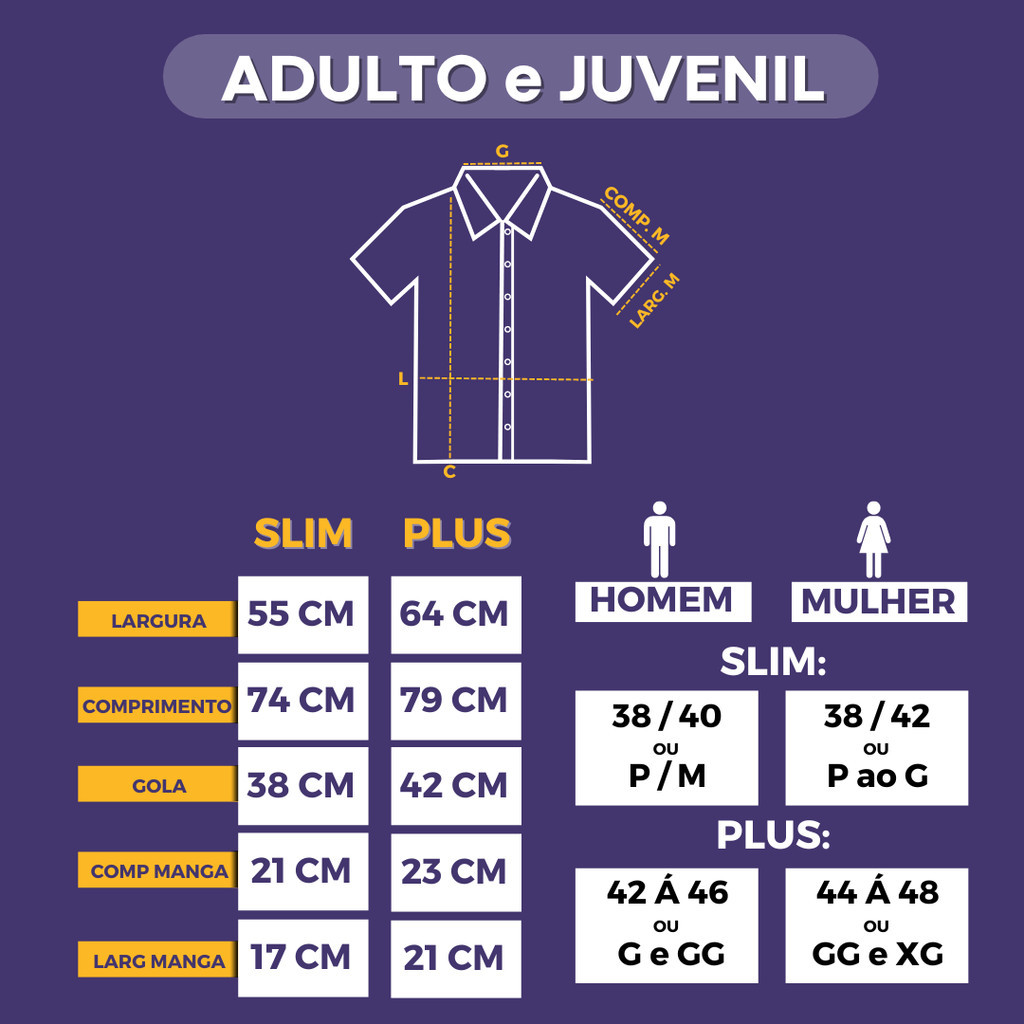 CAMISARIA UNISSEX Tamanho: Slim FEMININO veste 38 até 42 MASCULINO veste 38 até 40 Tamanho: PLUS FEMININO veste 44 até 48 MASCULINO veste 42 até 46 Tecido: Super Soft especial Detalhes: diversas formas de usar - Não é transparente - Não faz bolinha