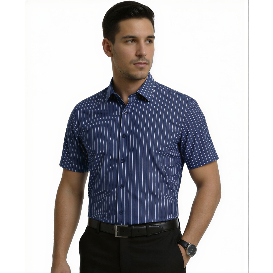 Camisa Social Listrada Manga Curta Confortável Tecido Leve Premium