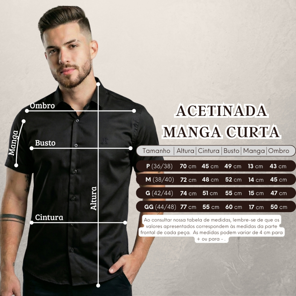 ⭐️ Camisa Social Masculina Manga Curta Acetinada Slim Fit Premium Hebron ⭐️ 🔥 ENVIO RÁPIDO! Postamos em até 24 horas úteis após a confirmação do pagamento. 🔥 Apresentamos a Camisa Acetinada Masculina Manga Curta da Hebron Camisaria, a peça essencial para um visual moderno, elegante e que valoriza o corpo masculino. ✅ Por que escolher esta camisa? Toque de Luxo: O acabamento acetinado confere um brilho sutil e sofisticado, elevando instantaneamente seu estilo. Conforto Premium: Confeccionada com 77% Poliester, 20% Viscose e 3% Elastano, a camisa é respirável, macia e tem um caimento que se ajusta perfeitamente ao corpo (modelo Slim Fit). Versatilidade: Perfeita para qualquer ocasião: balada, festas, trabalho (esporte fino), encontros ou momentos casuais. 🧵 Detalhes do Produto: Tecido: 77% Poliester, 20% Viscose e 3% Elastano Modelo: Manga Curta / Slim Fit Marca: Hebron Camisaria (Qualidade e acabamento superiores) 📏 Tabela de Medidas (Medidas da Parte Frontal da Peça): ATENÇÃO: Para o caimento perfeito, compare as medidas com uma camisa que você já tem. Tamanho Busto (Frente) Cintura (Frente) Manga Ombro Altura P (36/38) 49 cm 45 cm 13 cm 43 cm 70 cm M (38/40) 52 cm 48 cm 14 cm 45 cm 72 cm G (42/44) 55 cm 51 cm 15 cm 47 cm 74 cm GG (44/48) 60 cm 55 cm 17 cm 50 cm 77 cm Observação: As medidas referem-se à metade da circunferência (apenas a parte frontal em cm). Pode haver variação de ±3 cm. 🚚 Logística e Envio (Informações Cruciais): Envio Imediato: Postamos sua camisa em até 24 horas úteis após a aprovação do seu pedido. Entrega: O prazo de entrega é calculado pela Shopee, basta inserir seu CEP. Embalagem: Todos os produtos são conferidos e embalados com cuidado para chegar impecável até você. 🏷️ Tags de Busca: Camisa Masculina, Camisa Social, Camisa Manga Curta, Camisa Acetinada, Camisa Preto, Camisa Slim Fit, Camiseta Social, Roupa Masculina, Moda Masculina, Esporte Fino, Camisa Premium, Camisaria Hebron.