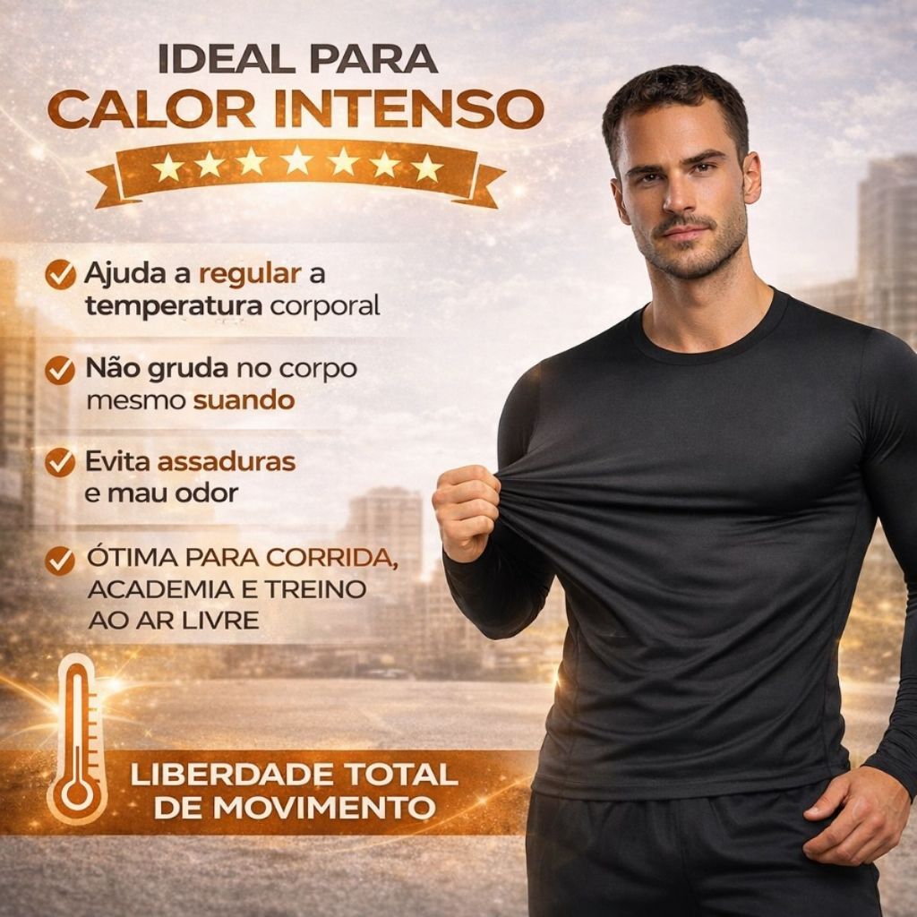 ☀️ Conforto real para quem vive no sol e no calor - Se você passa horas exposto ao sol, treina ao ar livre ou trabalha em ambientes quentes, sabe como uma camiseta comum incomoda. Esta camiseta térmica foi pensada para oferecer proteção UV funcional, conforto contínuo e liberdade de movimento no dia a dia. 👕 O que é o produto - Camiseta térmica manga longa, modelo segunda pele, com proteção UV integrada ao tecido, compressão leve, alta elasticidade e toque macio, indicada para uso esportivo, trabalho externo e rotina ao ar livre. ✅ Benefícios Ajuda a regular a temperatura corporal em ambientes quentes Proteção UV funcional para exposição solar diária Compressão leve que veste ao corpo sem incomodar Respirável e secagem rápida Não gruda no corpo mesmo com suor Liberdade total de movimento ⭐ Diferenciais Alta elasticidade (4 direções) Resistente ao cloro para uso frequente Anti odor (tecnologia do tecido) Lavável em máquina Indicada para uso contínuo em atividades externas Conforto prolongado sem pesar 📏 Especificações essenciais Modelo: Camiseta térmica segunda pele Mangas: Longas Ajuste: Justo ao corpo (compressão leve) Tecido: Malha leve, respirável e elástica Indicação: Sol, calor, esportes, trabalho externo, lazer ao ar livre ⚠️ Orientações importantes Produto com modelagem ajustada ao corpo Se preferir um caimento mais solto, escolha um tamanho maior Não substitui o uso de protetor solar químico Indicada para calor e exposição solar. A cor pode variar levemente conforme a iluminação das fotos 📦 Conteúdo da embalagem - 1 Camiseta Térmica Proteção UV 📐 Tabela de tamanhos Tamanho P • Comprimento: 59 cm • Largura: 44 cm • Mangas: 55,5 cm Tamanho M • Comprimento: 63 cm • Largura: 49 cm • Mangas: 58,5 cm Tamanho G • Comprimento: 65 cm • Largura: 51 cm • Mangas: 60 cm Tamanho GG • Comprimento: 71 cm • Largura: 53 cm • Mangas: 63 cm Consulte a tabela de medidas do anúncio antes da compra.