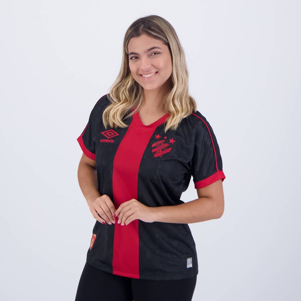 A Umbro apresenta a camisa III do Sport para 2023, o manto foi inspirado no traje "Sport Fino", termo usado por um dos torcedores mais ilustres do Leão, Ariano Suassuna. A peça exibe design na cor preta e uma faixa vertical vermelha, fazendo referência a brincadeira feita por Ariano Suassuna para se referir ao seu costume preferido, inspirado no Leão, terno preto e camiseta vermelha. Além disso, são vistos de forma texturizada, pictogramas caracteristicos da obra do autor, inspirados no Movimento Armorial, vertente artístico-cultural, que tem Suassuna como um dos principais idealizadores, para valorizar as artes populares nordestinas. Na parte inferior, traz um selo estilizado como um livro com o artista na capa, o ano de nascimento com o símbolo do infinito, traz icônica frase "Felicidade é torcer pelo Sport" na estampa e na nuca. Ariano Suassuna foi um intelectual, escritor, filósofo, teórico da arte, dramaturgo, romancista, ensaísta, poeta, artista plástico, professor, advogado, palestrante brasileiro e um apaixonado pelo Sport Recife. Composição: 100% Poliéster Cor Predominante: Preta Indicado para: Jogo Clube: Sport Recife Origem: Nacional Gênero: Feminino Escudo: Bordado Manga: Curta Gola: V Dimensões aproximadas (A x L): P: 65 x 47 cm M: 67 x 50 cm G: 68 x 54 cm GG: 70 x 56 cm