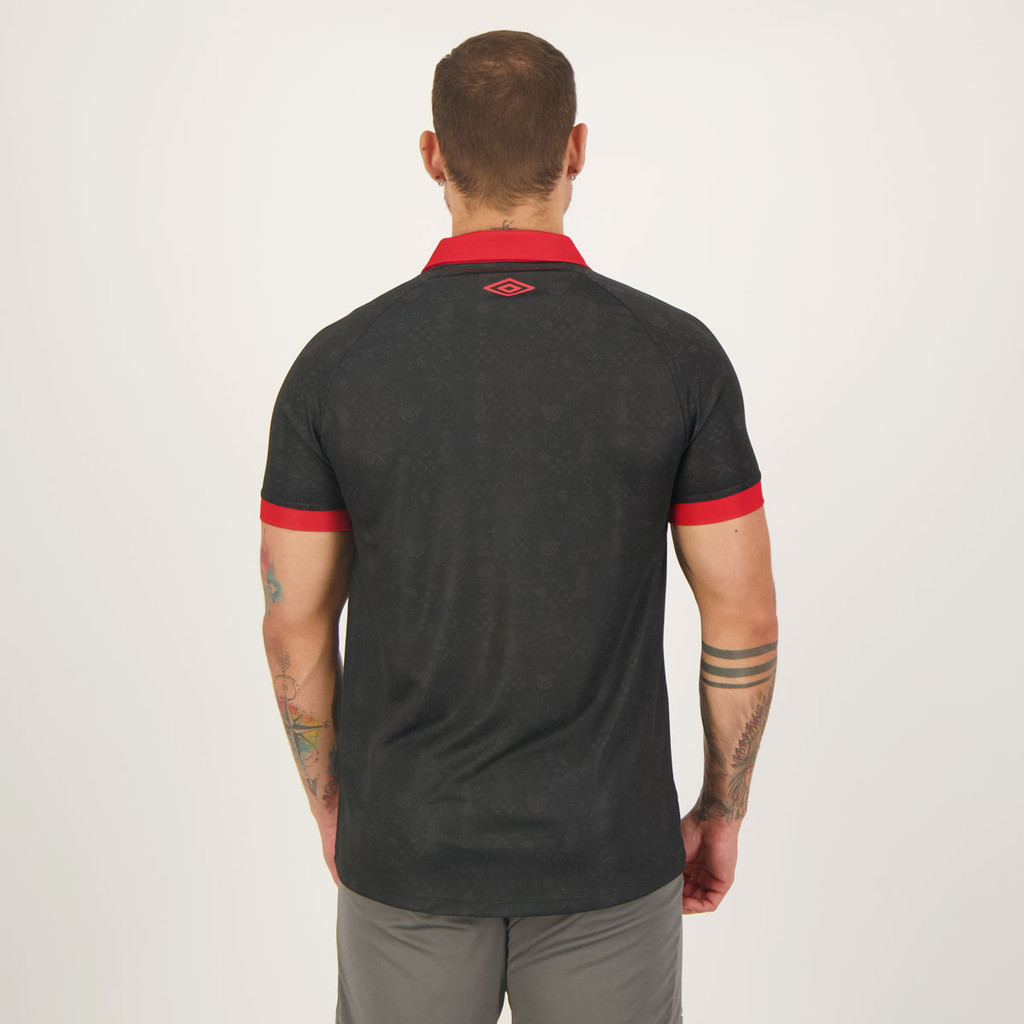 A Umbro apresenta a camisa III do Sport para 2023, o manto foi inspirado no traje "Sport Fino", termo usado por um dos torcedores mais ilustres do Leão, Ariano Suassuna. A peça exibe design na cor preta e uma faixa vertical vermelha, fazendo referência a brincadeira feita por Ariano Suassuna para se referir ao seu costume preferido, inspirado no Leão, terno preto e camiseta vermelha. Além disso, são vistos de forma texturizada, pictogramas caracteristicos da obra do autor, inspirados no Movimento Armorial, vertente artístico-cultural, que tem Suassuna como um dos principais idealizadores, para valorizar as artes populares nordestinas. Na parte inferior, traz um selo estilizado como um livro com o artista na capa, o ano de nascimento com o símbolo do infinito, traz icônica frase "Felicidade é torcer pelo Sport" na estampa e na nuca. Ariano Suassuna foi um intelectual, escritor, filósofo, teórico da arte, dramaturgo, romancista, ensaísta, poeta, artista plástico, professor, advogado, palestrante brasileiro e um apaixonado pelo Sport Recife. Composição: 100% Poliéster Cor predominante: Preta Indicada para: Jogo Clube: Sport Recife Gênero: Masculino Origem: Nacional Escudo: Bordado Manga: Curta Gola: Polo Dimensões aproximadas (A x L): P: 74 x 51 cm M: 76 x 54 cm G: 78 x 58 cm GG (2G): 80 x 62 cm EG (2GG): 82 x 66 cm EEG (3GG): 84 x 70 cm EEEG (4GG): 86 x 75 cm