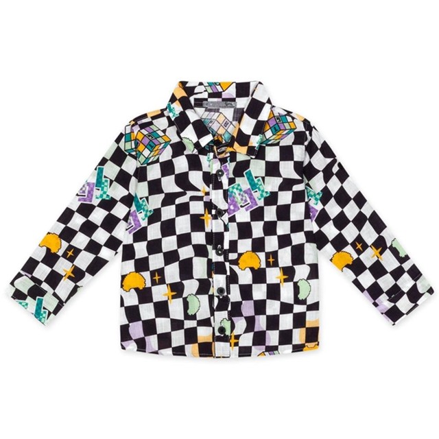 Camisa para menino confeccionada em tricoline maquinetado. Perfeita para garantir um visual superdescolado, possui mangas longas, punhos com abertura e botão, fechamento frontal em botões e estampa quadriculada em toda a peça, inspirada no universo gamer e nos cubos mágicos. Além disso, a camisa conta com botões nos braços para ajustar a manga conforme o momento, podendo usá-la dobrada ou com manga comprida. Aposte! É O must-have para os meninos nessa estação! • Camisa • Manga longa • Fechamento em botões • Estampa xadrez • Inspirada no universo gamer e cubos mágicos • Tricoline maquinetado