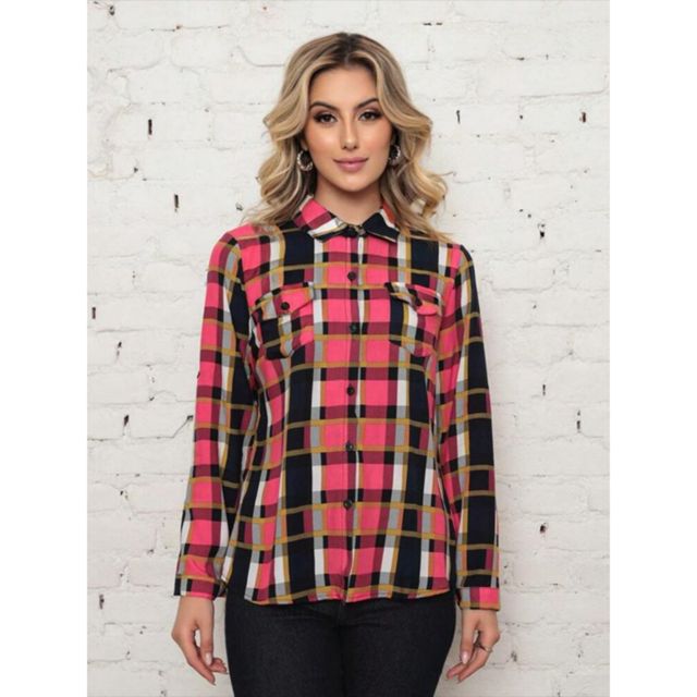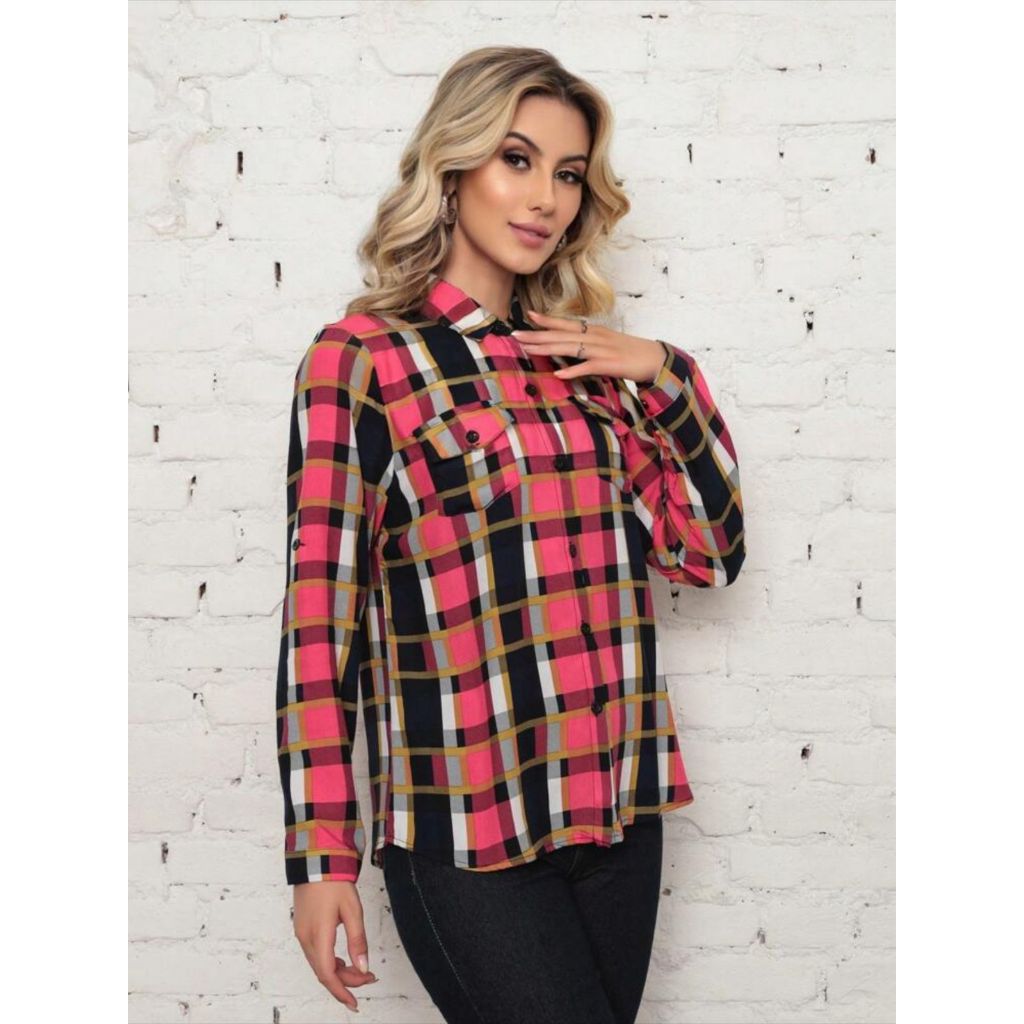 Camisa Xadrez Plus Size Manga Longa Tecido Viscose Forma pequena Moda Feminina