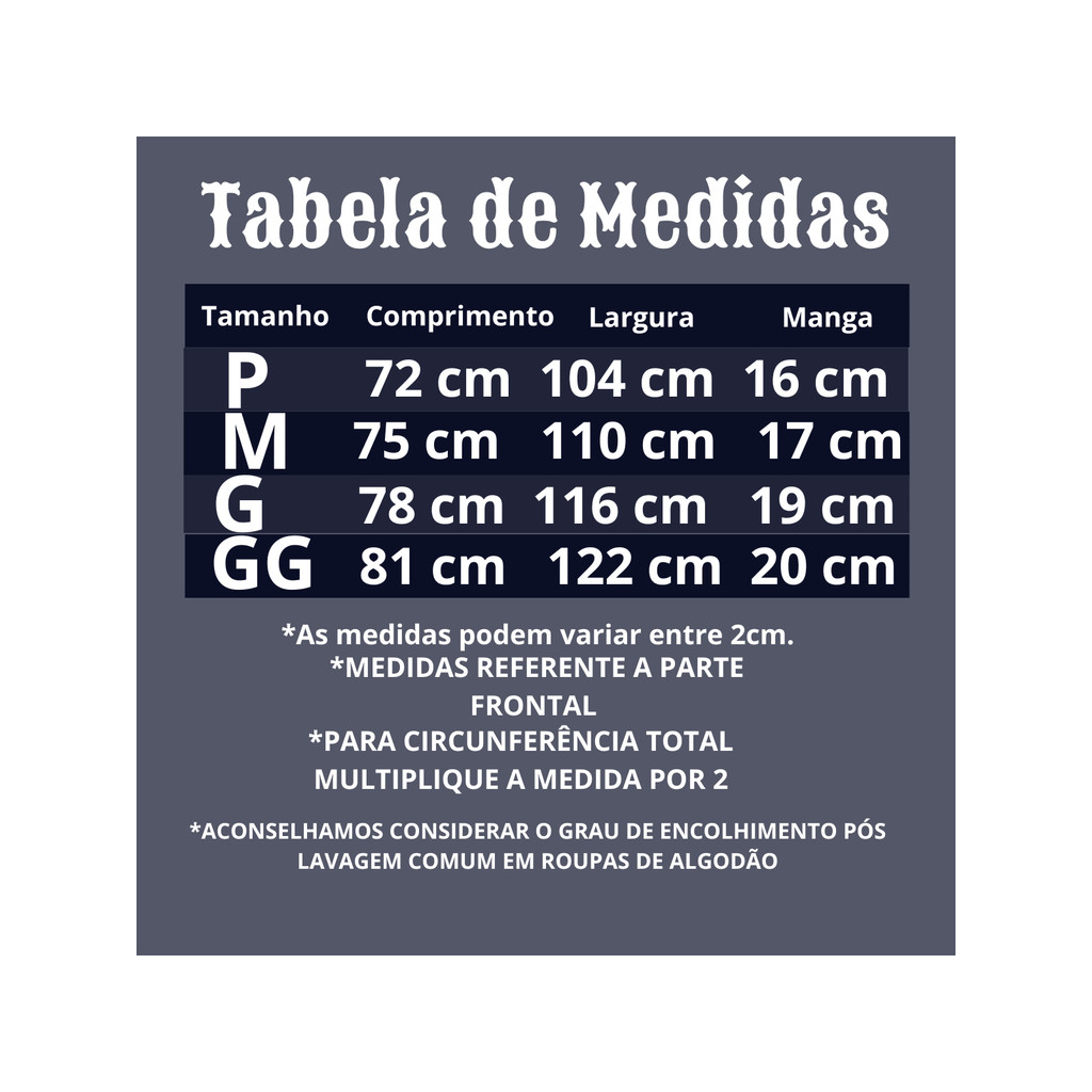 Se você é fã de JIU JITSU ou quer presentear alguém que ama esse esporte, essa camiseta é ideal! Feita com tecido 100% algodão de alta qualidade, ela é macia, confortável e leve, proporcionando o máximo de conforto para o uso diário ou em momentos de lazer. Material : 100% Algodão Modelagem : Regular Gênero : Masculino Tamanhos disponíveis : P, M, G, GG Cores disponíveis : Diversas opções Conforto premium : O tecido suave e leve garante um ótimo caimento e conforto durante o uso. Durabilidade : Cores resistentes a lavagens, mantendo uma estampa vibrante e sem desbotar. Design exclusivo : Estampas criativas inspiradas no universo da pesca, perfeitas para quem vive essa paixão. Versatilidade : ótima opção para looks casuais, prazeres esportivos ou até para sair à noite com estilo. Tabela de Medidas P : Comprimento: 72 cm | Circunferência: 104 cm | Mangá: 16 cm M : Comprimento: 75cm | Circunferência: 110 cm | Mangá: 17 cm G : Comprimento: 78 cm | Circunferência: 116 cm | Mangá: 19 cm GG : Comprimento: 81 cm | Circunferência: 122 cm | Mangá: 20 cm Cuidados: Lavar à mão ou à máquina em água fria. Não utilize alvejante. Secar à sombra para preservar os núcleos. Informações: Frete rápido : Enviamos seu pedido com agilidade para que você receba o mais rápido possível. Garantia e Troca : Garantia conforme o Código de Defesa do Consumidor, com trocas disponíveis em caso de problemas com o tamanho ou defeitos.