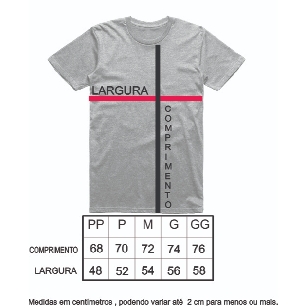 Trabalhamos somente com camisetas 100% algodão , ótima costura e acabamento. Camisetas feitas em serigrafia ( silk screen ) Malhas 100% algodão fio 30.1 penteado Reforço na gola e costura de ombro a ombro Tamanho médio da estampa na camiseta 30x40 Temos um tempo de produção e envio de 2 dias úteis Medidas das camisetas ( podendo variar cerca de 2 cm para menos ou para mais ) Pode haver variação de cores de acordo com o seu monitor ou smartphone PP – Altura 68 cm / Largura 48 cm P - Altura 70 cm / Largura 52 cm M – Altura 72 cm / Largura 54 cm G – Altura 74 cm / Largura 56 cm GG – Altura 76 cm / Largura 58 cm Camiseta do anúncio se iguala a uma camiseta tamanho P Antes de escolher um tamanho pegue uma camiseta sua de referencia e meça a altura e a largura e veja em nossa tabela de medidas qual se encaixa melhor . Camisetas feitas de fan para fan !