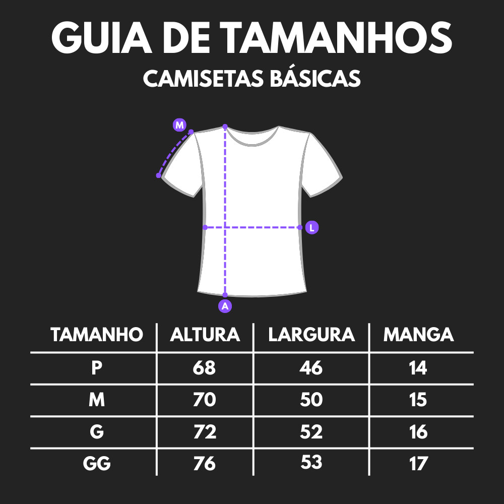 Nossas camisetas são fabricadas com tecido 100% Algodão 30.1 , se destacando pela sua durabilidade, suavidade ao toque, caimento elegante e respiranilidade. Essas características fazem com que essa peça seja uma opção de alta qualidade para aqueles que valorizam o conforto, e a estética em suas roupas. uma curiosidade é que o tingimento especial do fio 26 mantém à camiseta com um aspecto de nova mesmo após varias lavagens. Nossas estampas são feitas por máquinas DTF (Direct to Film) de altíssima qualidade, trazendo estampas com cores vivas e uma alta nitidez, resultando também em um toque macio e suave trazendo muita durabilidade para suas peças. As máquinas DTF são o que há de mais renovador e tecnológico no mercado atualmente no ramo de estamparia. Descrição Do Produto *Este é um produto 100% algodão 155/gramatura* - Costura reforçada acabamento de ombro a ombro - Pronta entrega - Malha 100% algodão 155/gramatura - Estampa em alta definição como da foto - Estampa super resistente, o produto pode ser lavado sem medo algum - Gola redonda / ribana lisa - Modelagem reta / tradicional Camisetas do P ao GG. Confira a disponibilidade dos tamanhos e cores dentro do anuncio antes de efetuar a compra. Abaixo temos a tabela de medidas aproximadas. (As medidas descritas são do produto após ser lavado) Tabela de Medidas: TAMANHO ALTURA LARGURA MANGA P 68 cm 46 cm 14 cm M 70 cm 50 cm 15 cm G 72 cm 52 cm 16 cm GG 76 cm 53 cm 17 cm As peças podem sofrer uma variação de até 2cm para + ou –