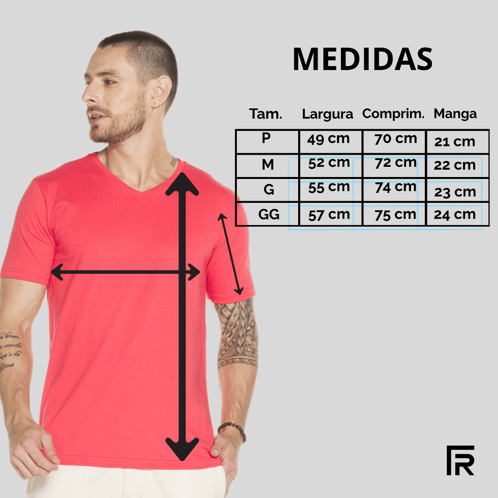 Nossa Camiseta V Premium é fabricada há mais de 30 anos pela empresa e já é validada por milhares de clientes pelo Brasil. Nossa modelagem já é testada por muitos anos, ajustada, moderna e veste o homem brasileiro. A malha penteada 100% algodão(exceto a cor mescla cinza que possui um pouco de poliéster), possui uma estrutura que encolhe pouco e quase não torce. Nossa costura é REFORÇADA de ombro a ombro, garantindo um produto durável. O modelo com a gola em V é despojado, moderno e serve para sair de dia, ou com um look mais moderno com sapato, à noite. Nossas medidas vestem: (NAS FOTOS TODA MEDIDAS DA PEÇA) P - 38 == comprimento: 72cm // largura: 49cm M - 40 == comprimento: 74cm // largura: 52cm G - 42 == comprimento: 76cm // largura: 55cm GG - 44 == comprimento: 77cm // largura: 58cm