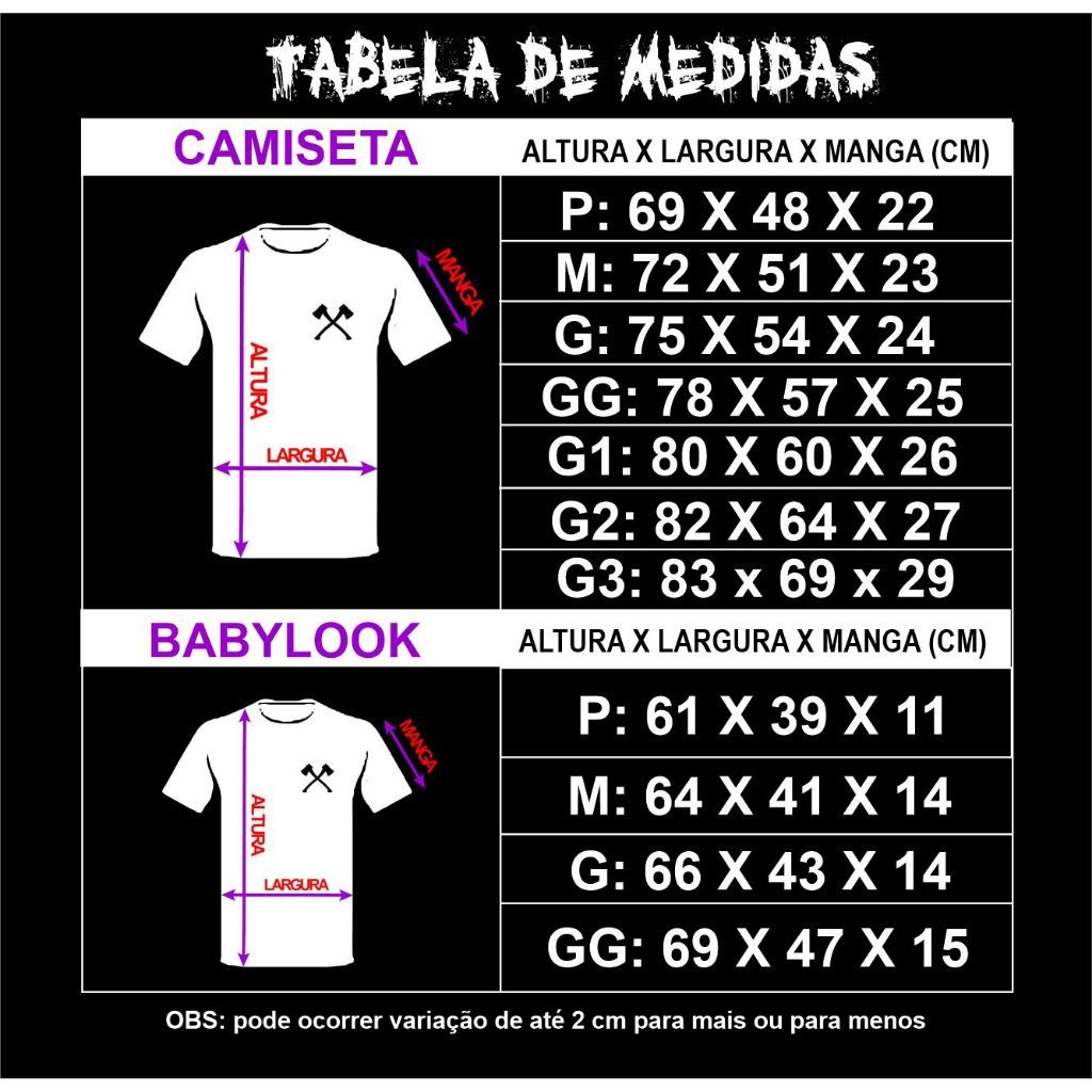 Nós somos a The Brave Custom Tees, uma marca de camisetas personalizadas com temas de filmes de terror e bandas de rock. Estamos sempre em busca de estampas diferenciadas e agregando o maximo de qualidade aos nossos produtos. Nossas camisetas são produzidas com malha 100% algodão fio 30.1 de alta qualidade, uma malha não muita grossa, para não esquentar e ser utilizada em dias quentes e nem tão fina, para não marcar tanto no corpo. As estampas são produzidas com o melhor DTF, estampas feitas para durar e cores vibrantes. Medidas Aproximadas CAMISETA Tamanho P : Altura X Largura X Manga 69X48X22cm Tamanho M : Altura X Largura X Manga 72X51X23cm Tamanho G : Altura X Largura X Manga 75X54X24 cm Tamanho GG : Altura X Largura X Manga 78X57X25 cm Tamanho G1: Altura X Largura X Manga 81X60X26 cm Tamanho G2: Altura X Largura X Manga 82,5X64,5X27,5 cm Tamanho G3: Altura X Largura X Manga 83X69X29 cm BABYLOOK Tamanho P : Altura X Largura X Manga 61 X 39 X 11,5 cm Tamanho M : Altura X Largura X Manga 64 X 41 X 14 cm Tamanho G : Altura X Largura X Manga 66 X 43 X 14 cm Tamanho GG : Altura X Largura X Manga 69 X 47 X 15 cm Pode ocorrer variação de até 2 cm de tamanho por conta do processo de costura manual. *Dica: Compare as nossas medidas com alguma camiseta que já tenha em sua casa e assim acerte no tamanho; Estamos abertos a qualquer tipo de dúvidas, não hesite em perguntar. Só assim poderemos oferecer o melhor atendimento necessário. Seguimos a disposição Equipe The Brave Custom Tees